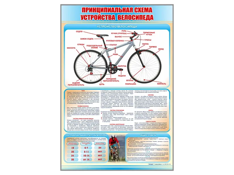 Стенд представляет собой информационную панель, на которой изображена принципиальная схема устройства велосипеда, а также размещены общие советы по эксплуатации велосипеда и сведения о том, как правильно выбирать детский велосипед.