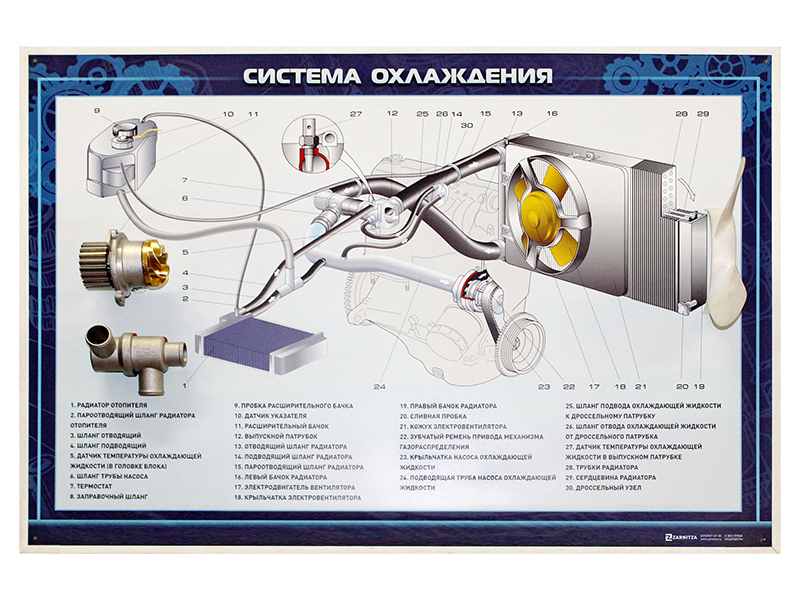 Стенд представляет собой информационную панель, на которой размещены навесные агрегаты и сведения о системе охлаждения двигателя внутреннего сгорания легкового автомобиля.