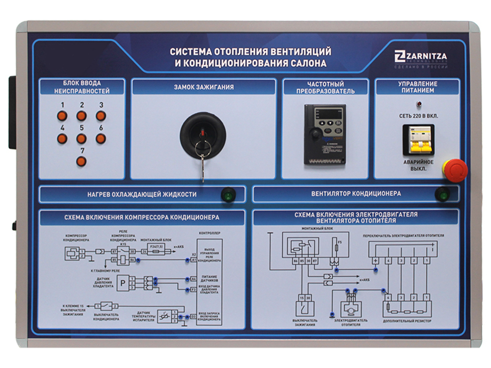 Стенд-тренажер "Система отопления, вентиляции и кондиционирования салона" (далее – стенд) предназначен для изучения функционирования автомобильных систем кондиционирования, а также проведения лабораторных работ по ремонту и заправке системы хладагентом.