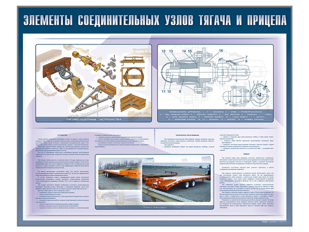 Стенды предназначены для наглядного отображения информации о тягово-сцепном устройстве, седельно-сцепном устройстве, их техобслуживании и ремонте, а также для формирования у учащихся автошкол знаний об устройстве транспортных средств категории "E".