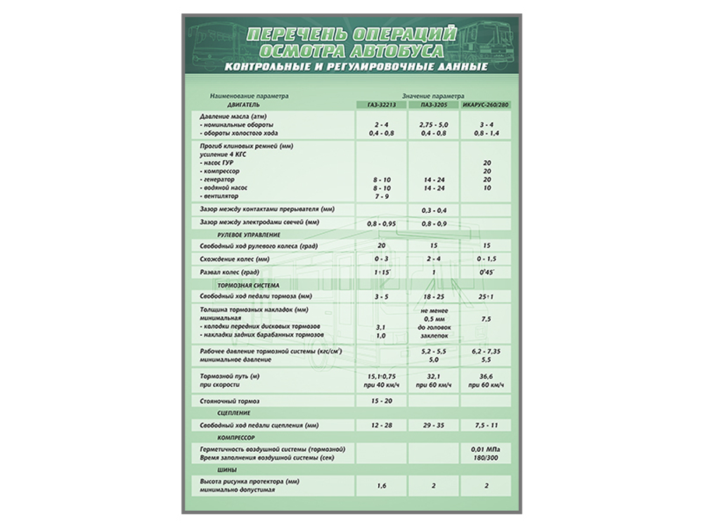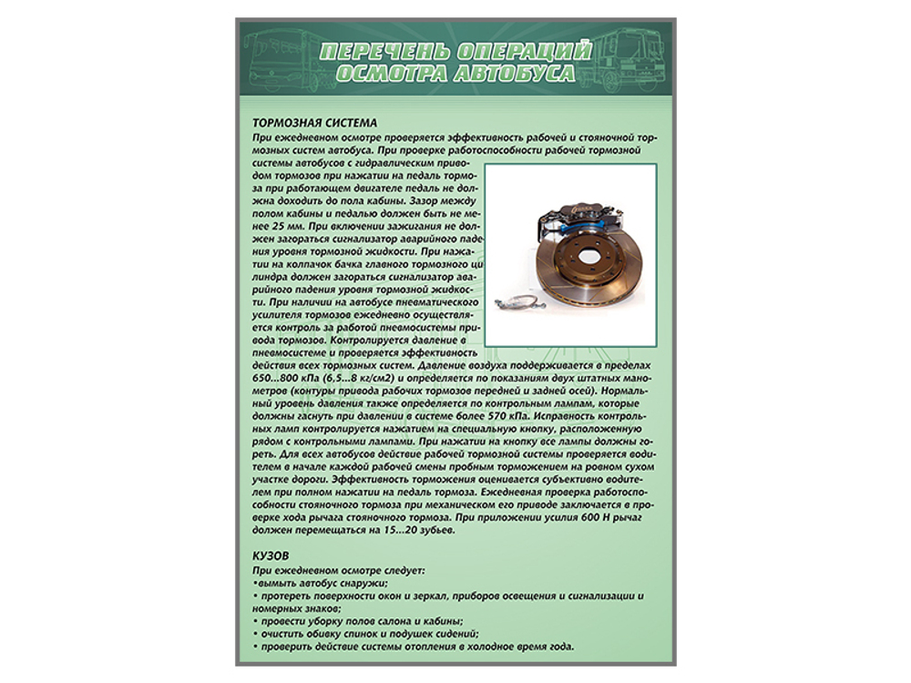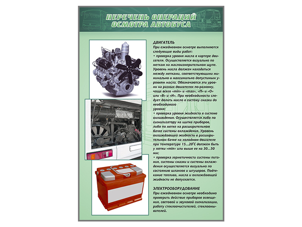 Стенды представляют собой информационные панели, на которых размещен перечень операций осмотра автобуса.