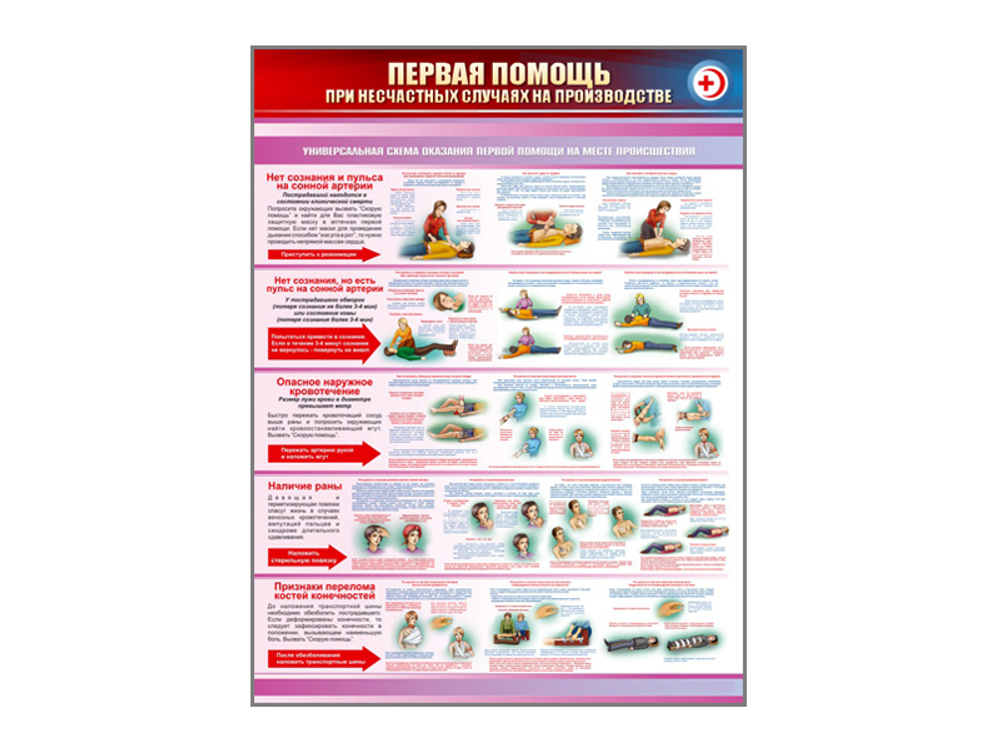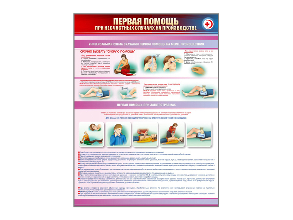 Стенды представляют собой информационные панели, на которых размещены правила оказания первой помощи при несчастных случаях на производстве.