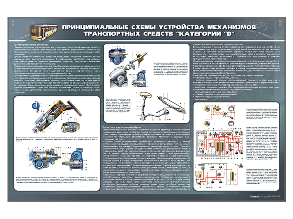 Стенды представляют собой информационные панели, на которых изображены следующие принципиальные схемы устройства механизмов транспортных средств категории "D":
