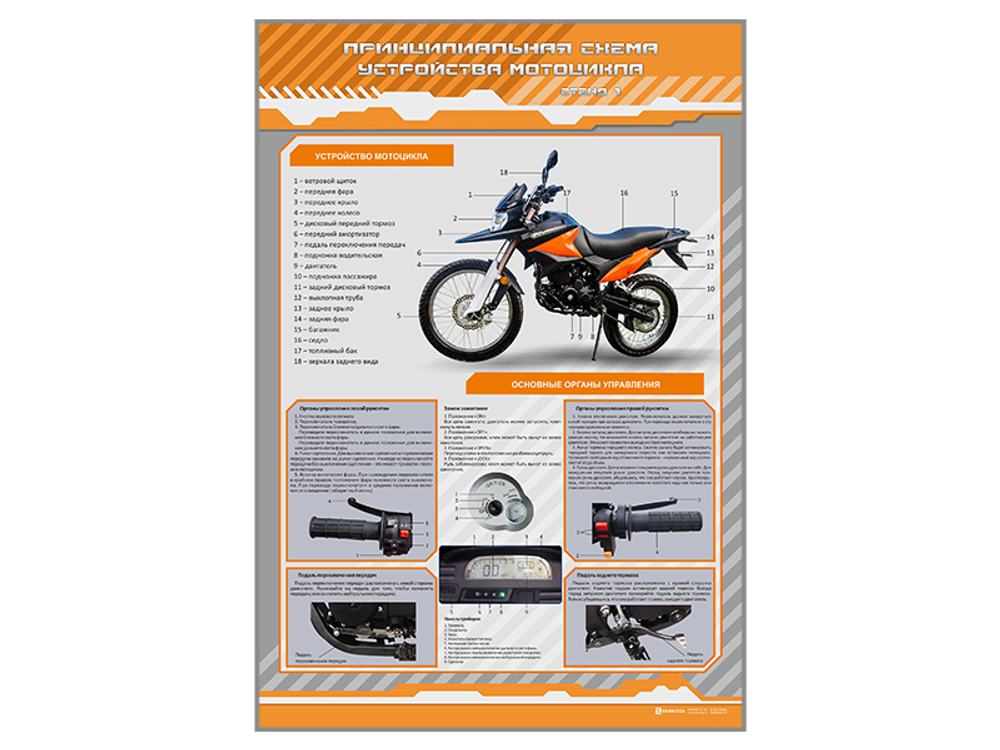 Стенды представляют собой информационные панели, на которых размещены сведения об основах управления мотоциклом и изображены принципиальные схемы его устройства.