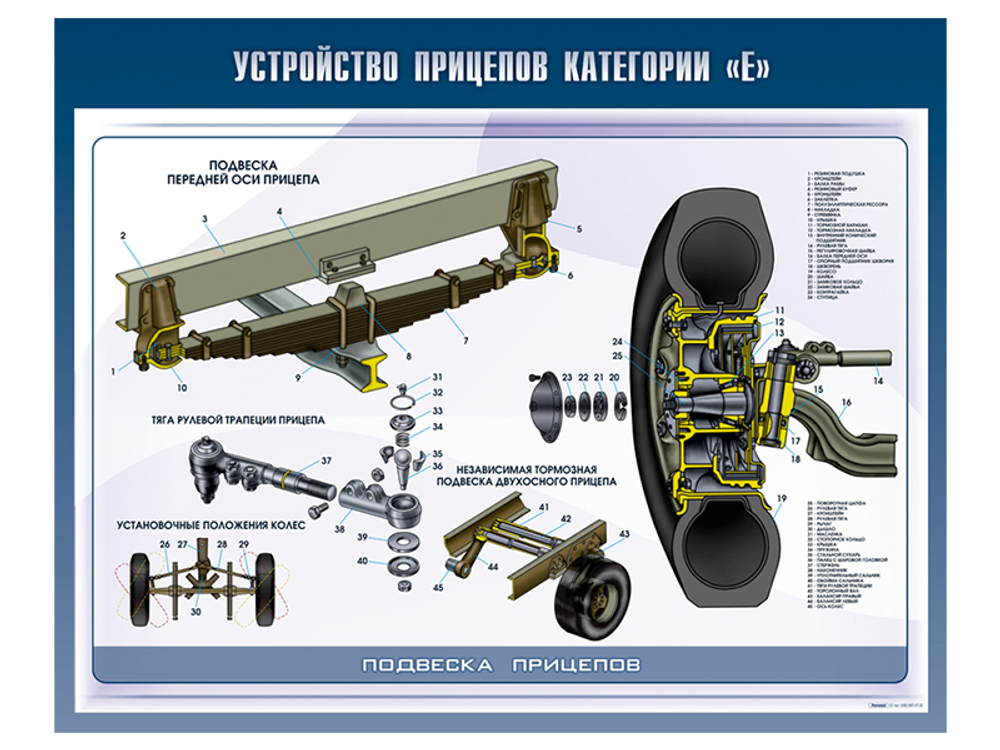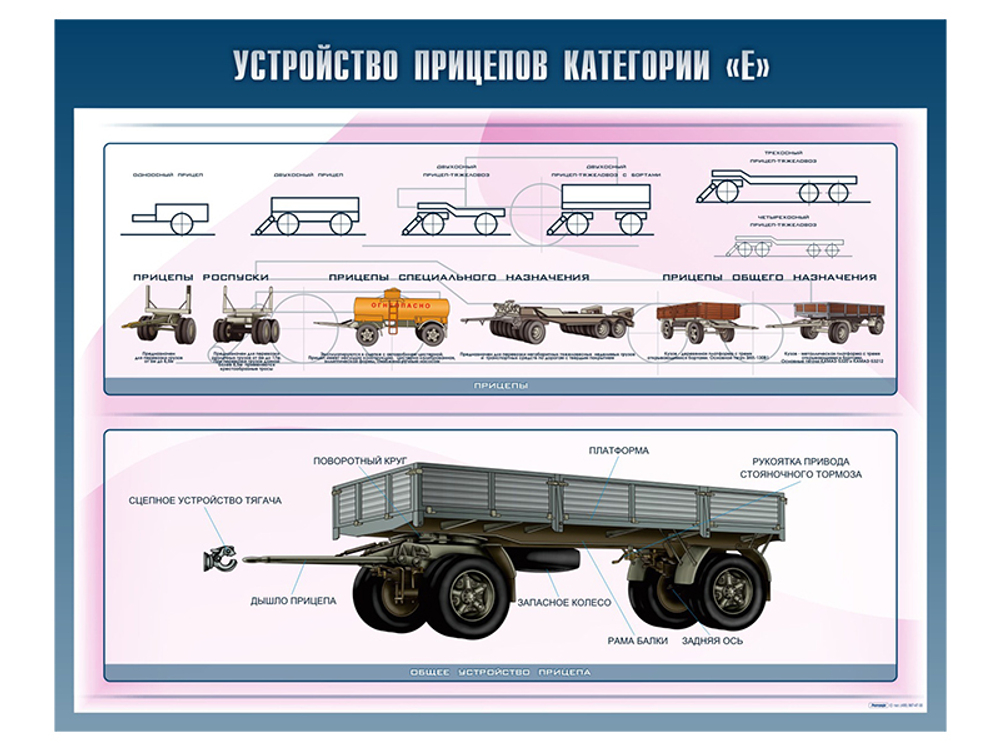 Стенды предназначены для наглядного отображения информации о видах прицепов, их общем устройстве, подвеске, а также для формирования у учащихся автошкол знаний об устройстве транспортных средств категории "Е".
