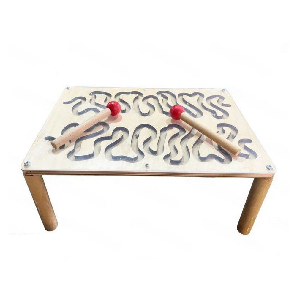 Перемещение шариков по лабиринту с помощью палочек требует точности и координации движений, способствуя развитию моторики рук у детей.
