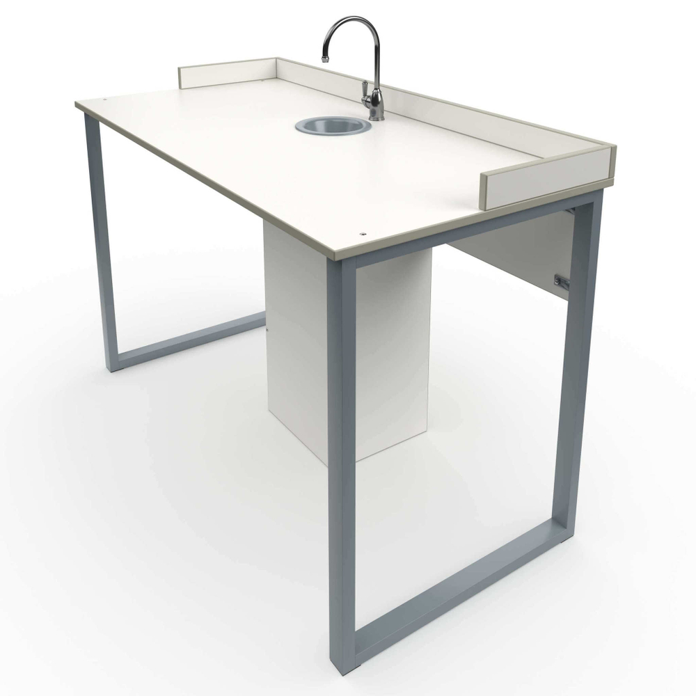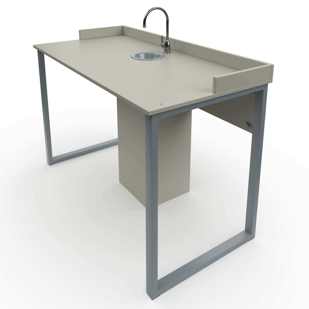 Столешница лабораторного стола выполнена из ДСП с пластиковым покрытием толщиной 26мм, торцы закрыты противоударной кромкой ПВХ толщиной 2мм. Фронтальная панель, бортики и тумба выполнены из ЛДСП 16мм, торцы закрыты противоударной кромкой ПВХ. Металлический каркас стола состоит из 2-х опор О-образной формы. Опоры выполнены из прямоугольного профиля 25х40 мм с толщиной стенок не менее 1,5 мм и покрыты порошковой краской стойкой к химическим и механическим воздействиям. В комплекте со столом идет пластиковая раковина и кран. Стол устанавливается на полимерные подпятники, предотвращающие повреждение напольного покрытия.