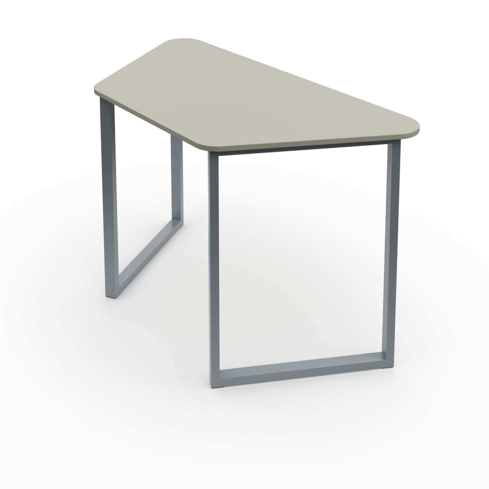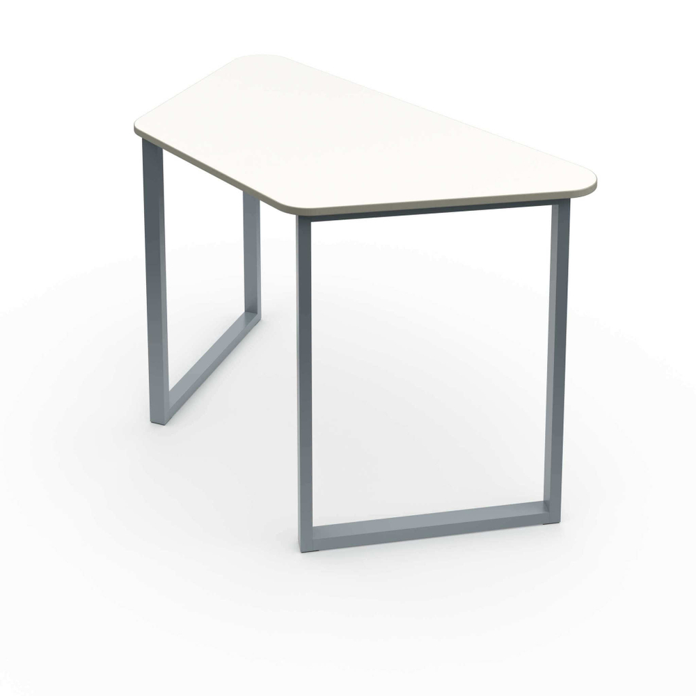Столешница выполнена из ЛДСП 16мм и имеет форму трапеции с закругленными углами. Торцы столешницы закрыты противоударной кромкой ПВХ толщиной 2мм. Металлический каркас стола состоит из 2-х опор О-образной формы соединенных двумя металлическими траверсами. Опоры выполнены из прямоугольного профиля 25х40 мм с толщиной стенок не менее 1,5 мм и покрыты порошковой краской стойкой к химическим и механическим воздействиям. Траверсы полнены из квадратного профиля 25х25 мм с толщиной стенок не менее 1,2 мм и покрыты порошковой краской стойкой к химическим и механическим воздействиям. Стол устанавливается на полимерные подпятники, предотвращающие повреждение напольного покрытия. Трапецевидная форма столешницы позволяет составлять столы вместе в шестигранник, треугольник.