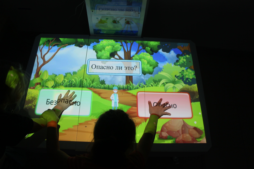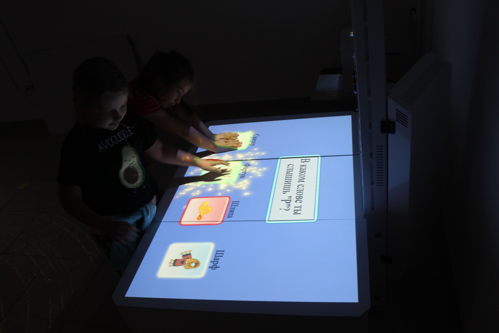 Дети взаимодействуют со столом, нажимая на виртуальные сенсорные "кнопки", чтобы выполнить задания.