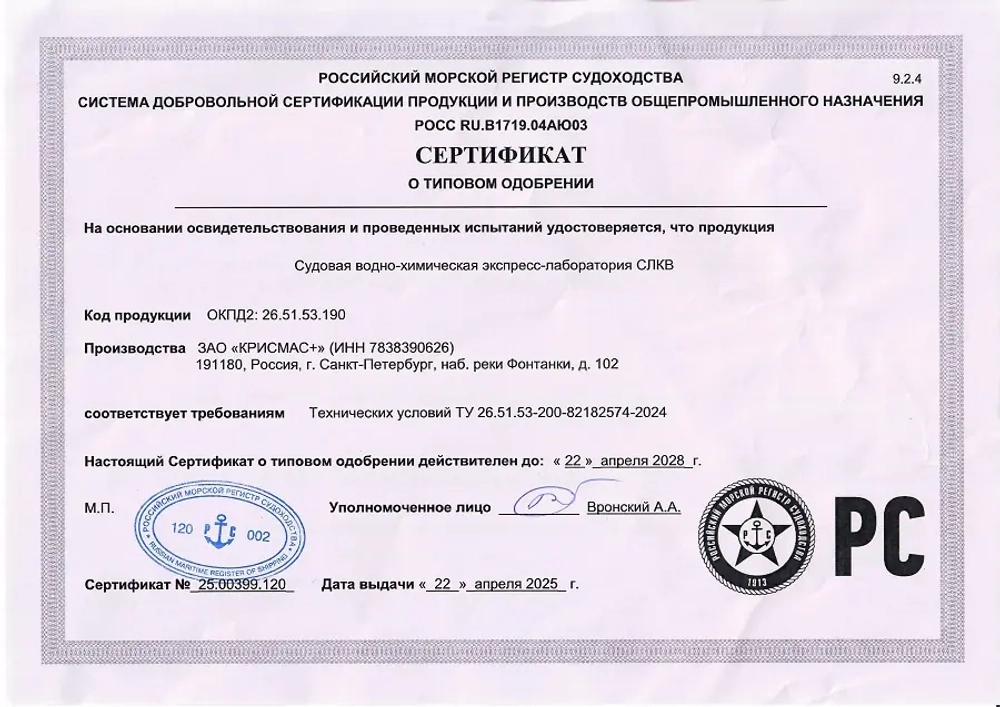 Судовая водно-химическая экспресс-лаборатория СЛКВ-3, разработанная и производимая ЗАО «Крисмас+», широко и успешно применяется инженерно-техническими работниками, а также младшим обслуживающим персоналом (механики, техники, лаборанты) для: