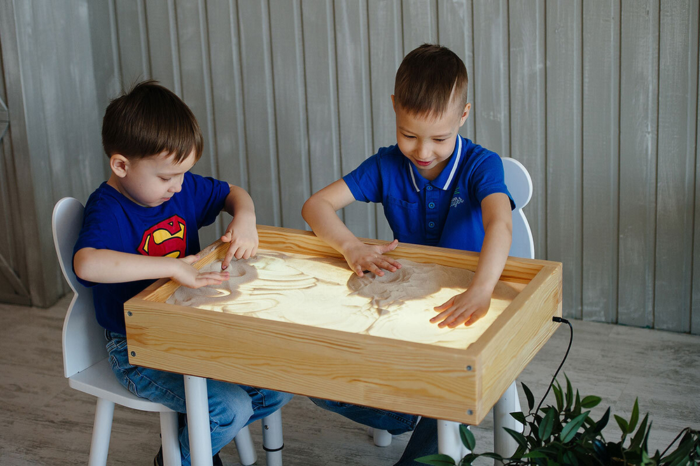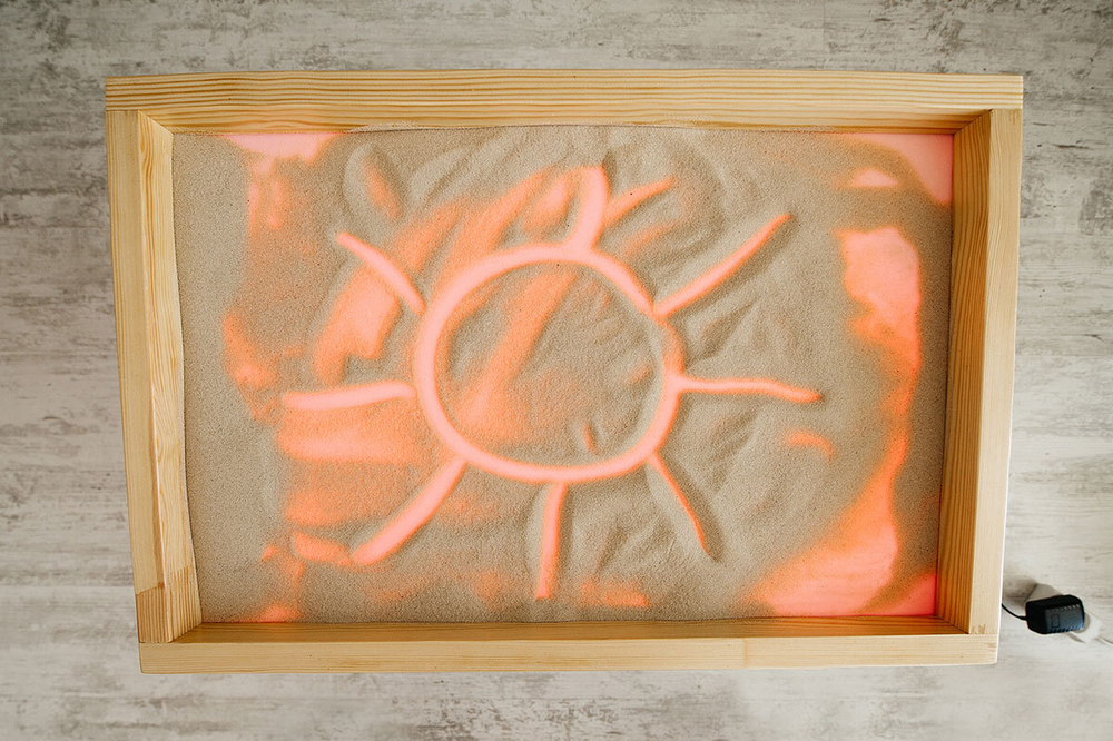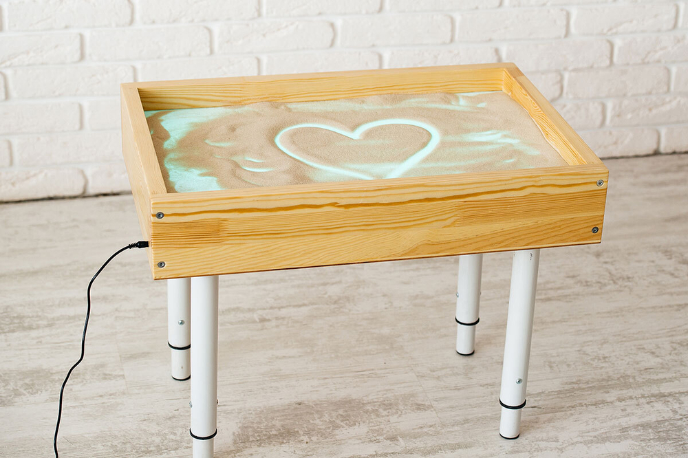 Световой стол представляет собой прямоугольный стол на высоких ножках, в который встроен резервуар с песком и светодиодный механизм, подсвечивающий песок разноцветным светом.