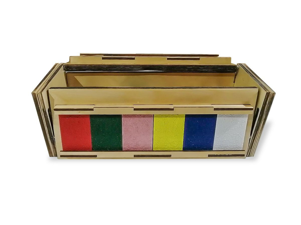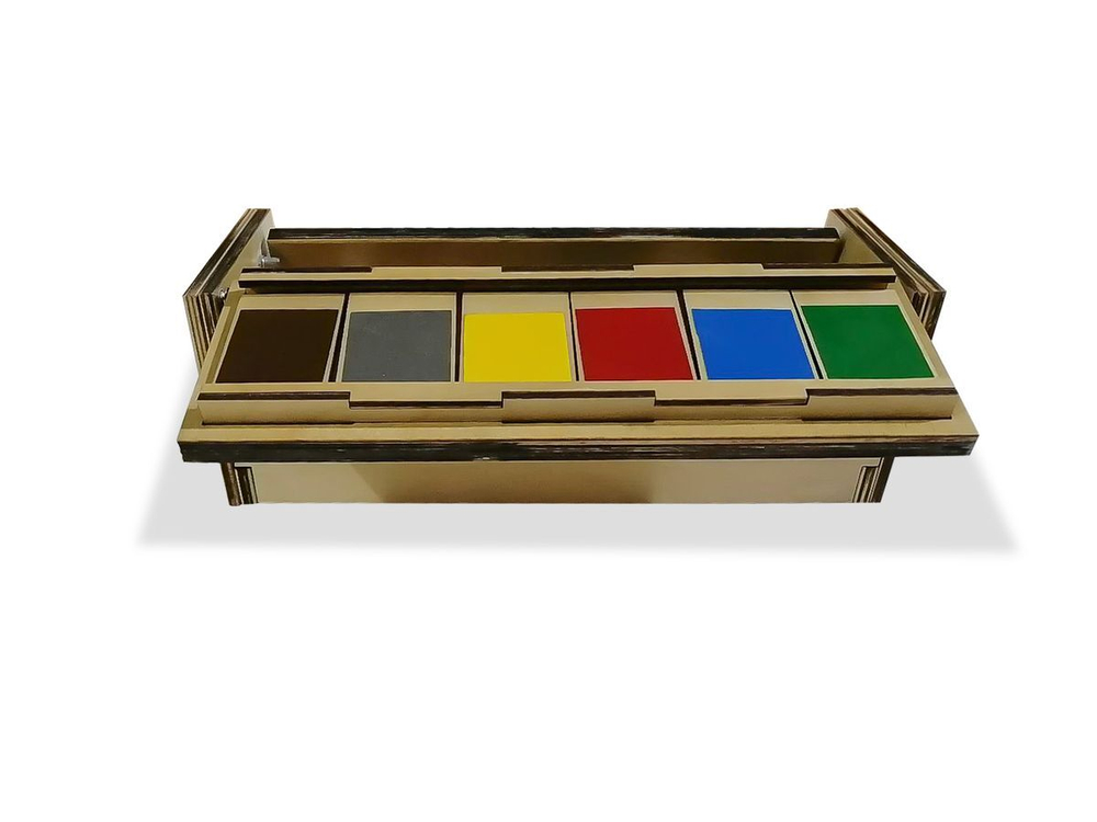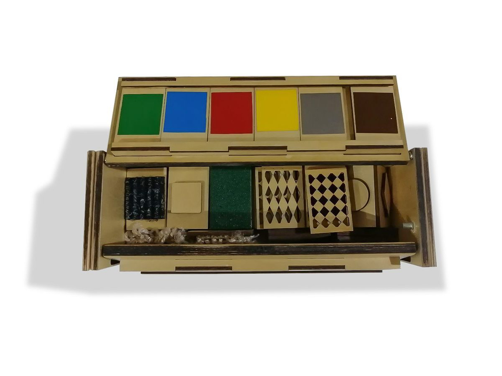 Представляет собой набор карточек, на лицевой стороне которых даны разные изображения: геометрические фигуры, цвета, числа, тканевые вставки, резные дощечки и пр. Все они собраны в компактном деревянном ящике, на крышке которого можно собирать карточки.