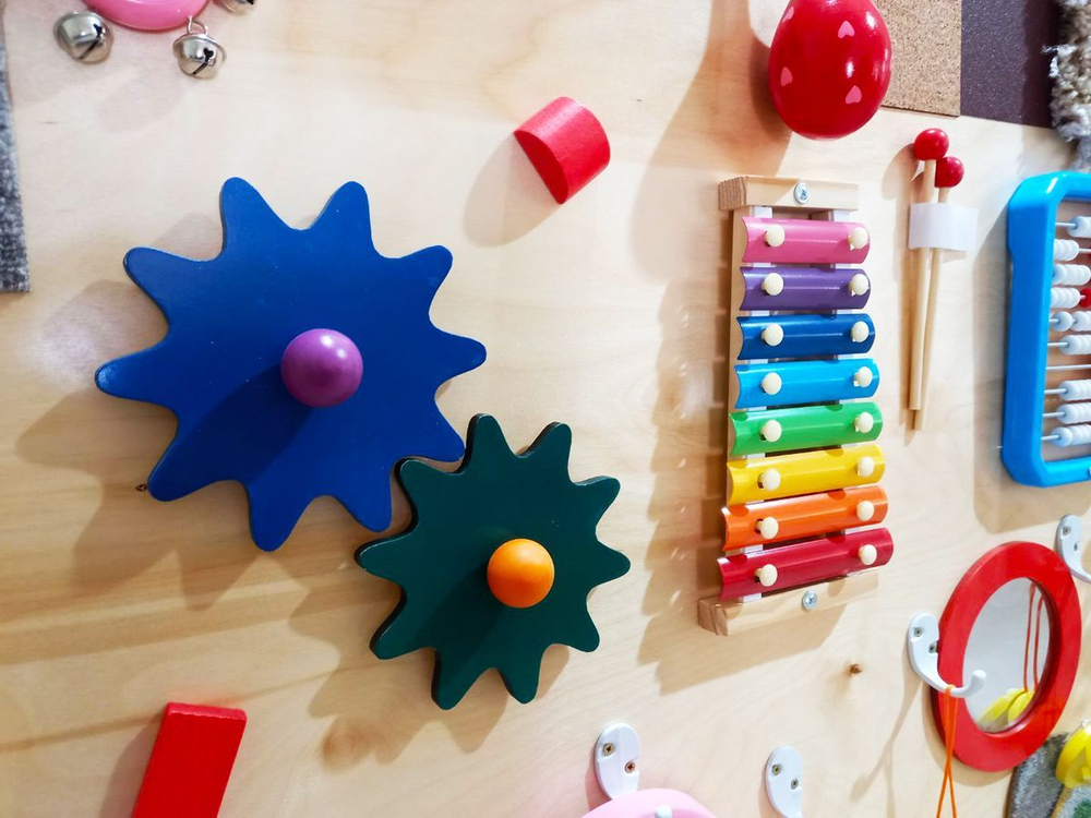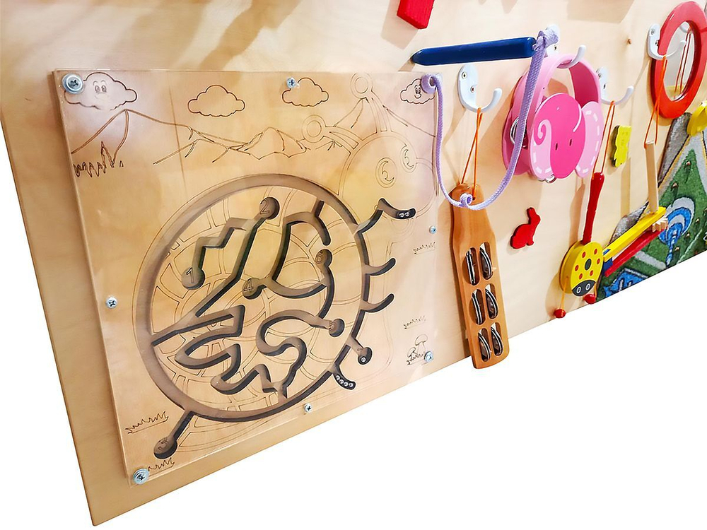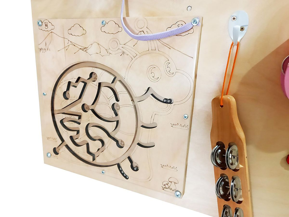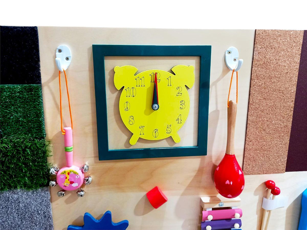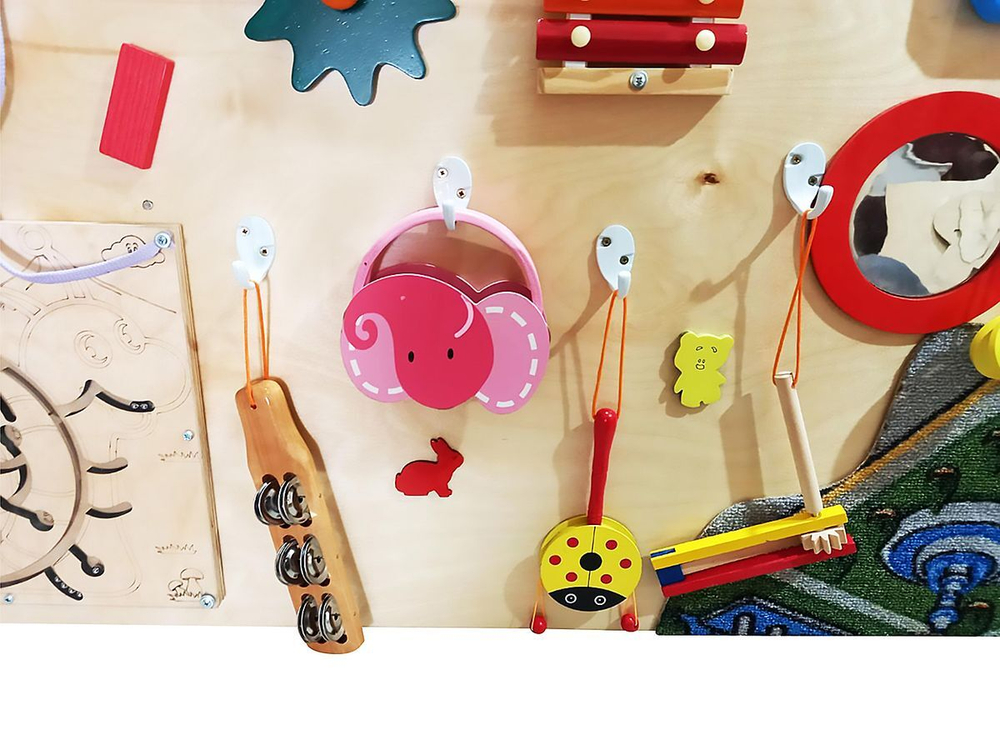 Для хранения съемных элементов бизиборд оборудован мебельными крючками.