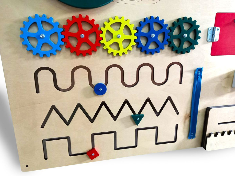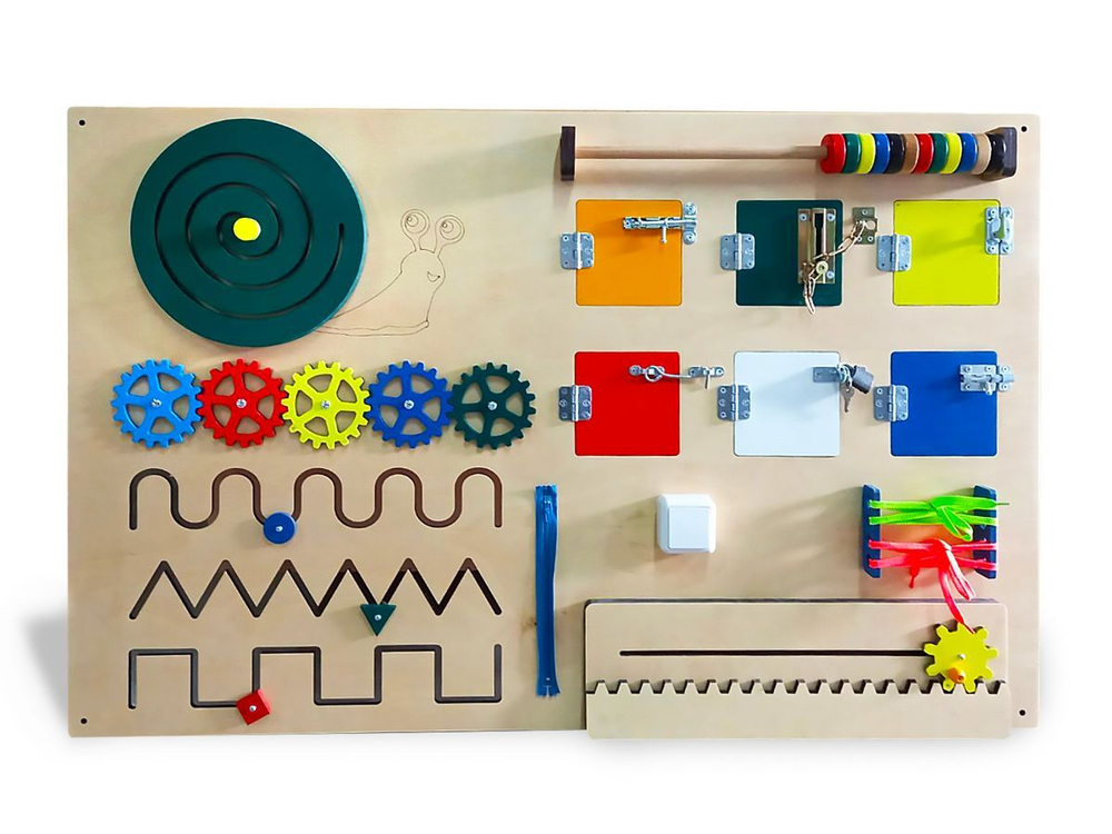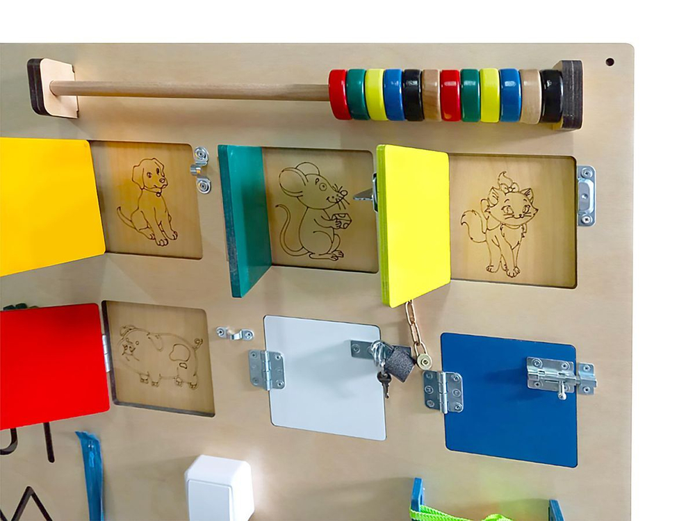 «Дети играют» – это тактильная панель, предназначенная для развития мелкой моторики и бытовых навыков ребенка. Представляет собой деревянную панель с подвижными элементами, с которыми может взаимодействовать ребенок. Он крутит шестеренки, включает свет и открывает замки, постепенно развивая необходимые для этого возраста навыки.