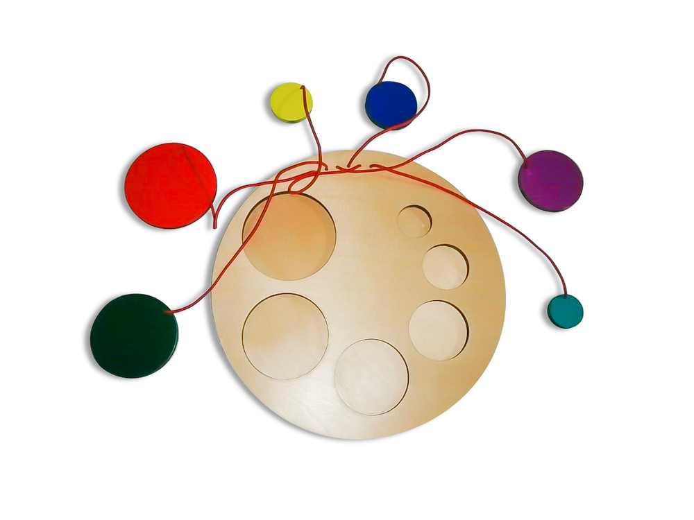 Веревочки, которыми присоединяются элементы к панели, не дают цветным дискам потеряться и тем самым нарушить целостность оборудования;