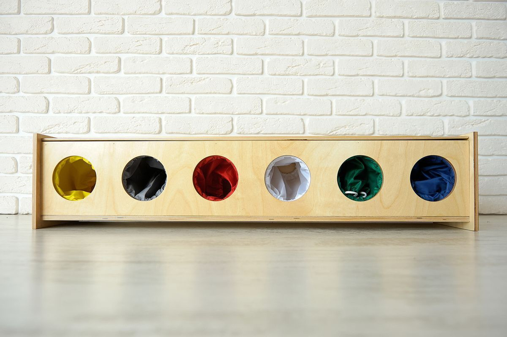 Тактильный модуль выполнен их качественной экологически чистой фанеры. Поверхность изделия гладкая, приятная на ощупь. Мешочки желтого, серого, красного, белого, синего и зеленого цветов, сшиты из прочной качественной ткани.