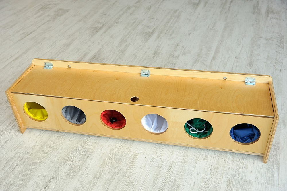 Тактильные ячейки предназначены для развития и обучения детей до 7 лет. Это короб с открывающейся верхней крышкой и отверстиями сбоку для рук. Изнутри короба к отверстию прикреплены тканевые цветные мешочки. Во внутрь мешочков помещаются различные предметы, отличные по форме, фактуре, плотности, весу. Ребенок, просовывает руку в мешок и ощупывает его содержимое, выполняя задания педагога.