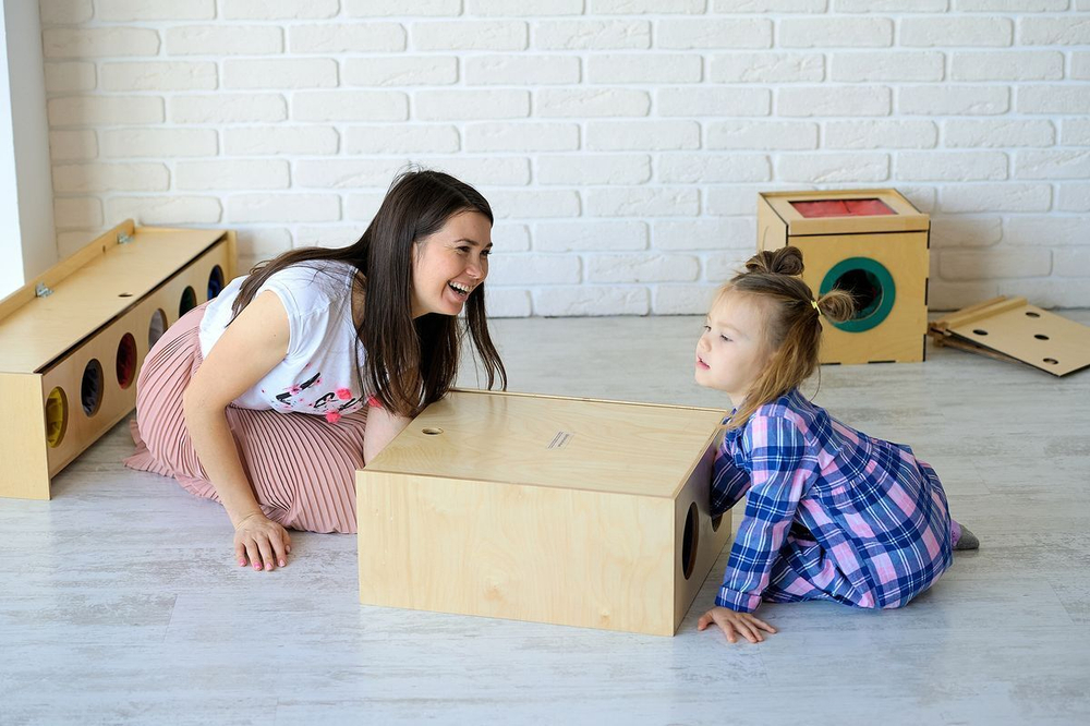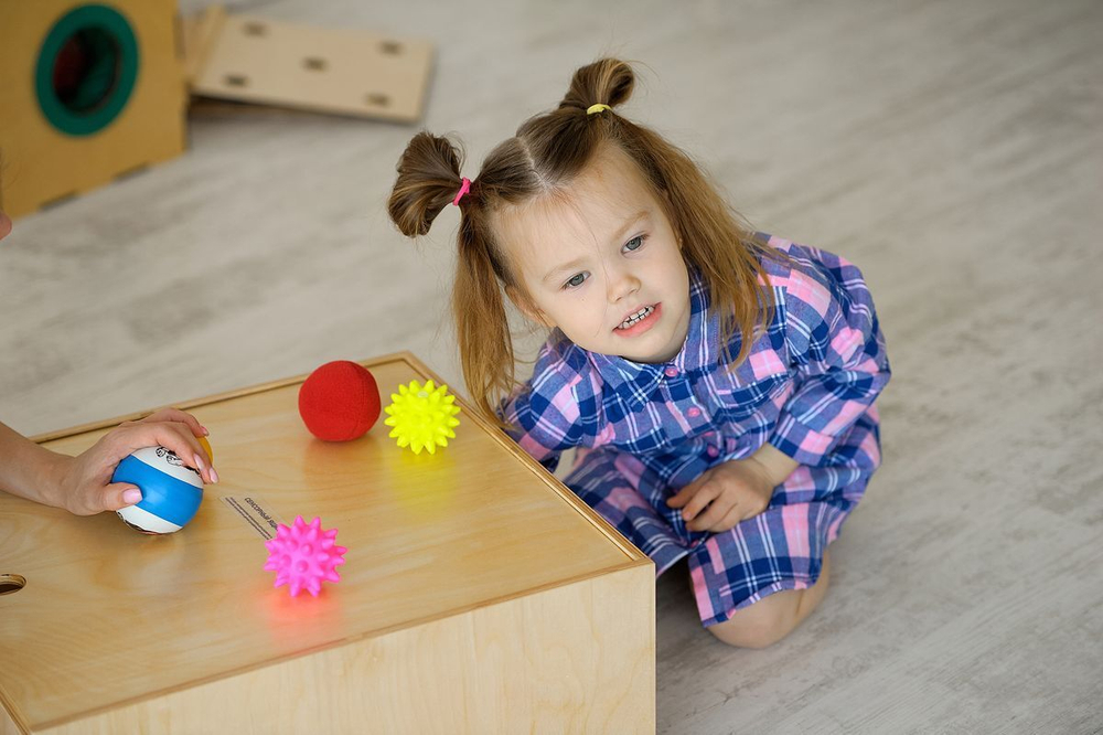 • Установите короб на стол или на пол. Положите во внутрь каждой ячейки несколько мячиков, так чтобы ребенок не видел ваших действий. Предложите ребенку просунуть руку в короб, выбрать мячик и рассказать какой он, не вынимая его.