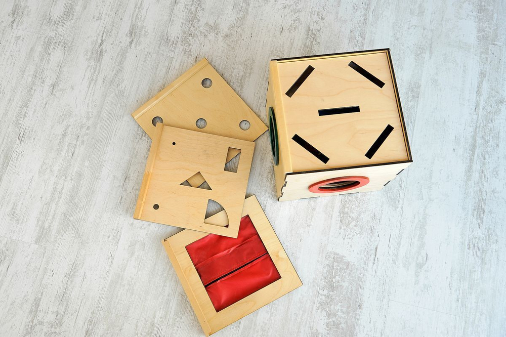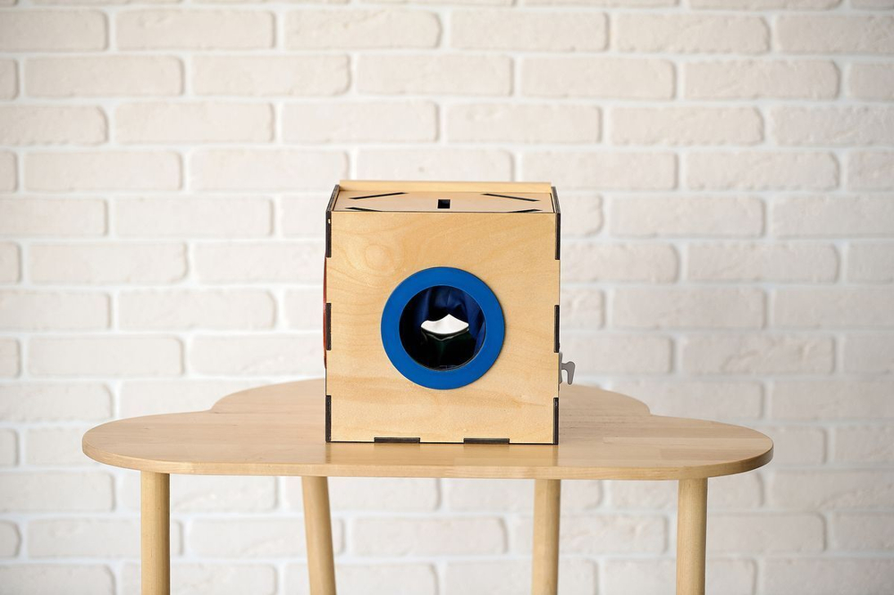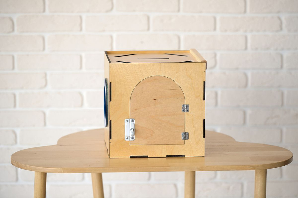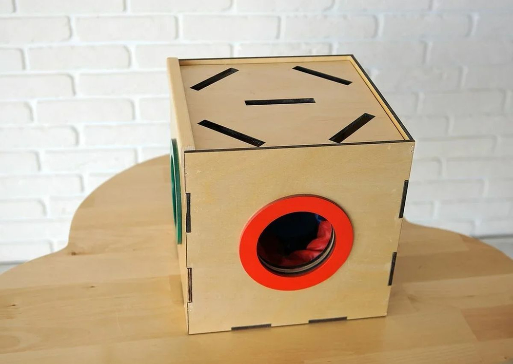 Закрытая конструкция со специальными прорезями для рук привлекает детское внимание своей таинственностью. Дети осваивают навыки анализа и описания, развивают моторику и дикцию. Ящик открывает широкий простор для детского воображения, ведь внутри может оказаться что угодно. Педагог перед занятием кладет внутрь разные предметы, а дети, засовывая руку в отверстие, должны описать первый попавшийся предмет. Ящик можно использовать в качестве сортера, для этого у него есть сменные крышки с различными прорезями. Оборудование рекомендовано для развивающих игр в дошкольных учреждениях и организациях, занимающихся развитием детей.