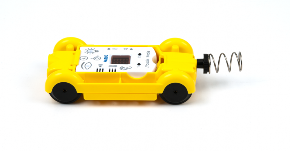 Тележка для экспериментов с модулем //Code PASCO специально разработана для проведения экспериментов по теме «Движение». На одной из осей тележки находится магнит, который вращается вместе с осью. На тележку устанавливается модуль для программирования //code.Node (приобретается отдельно), встроенный датчик магнитного поля которого считывает вращающееся поле и интерпретирует его как скорость. Направление вращения определяется с помощью двух осей датчика магнитного поля. Это показание отображается датчиком движения как положение и скорость.