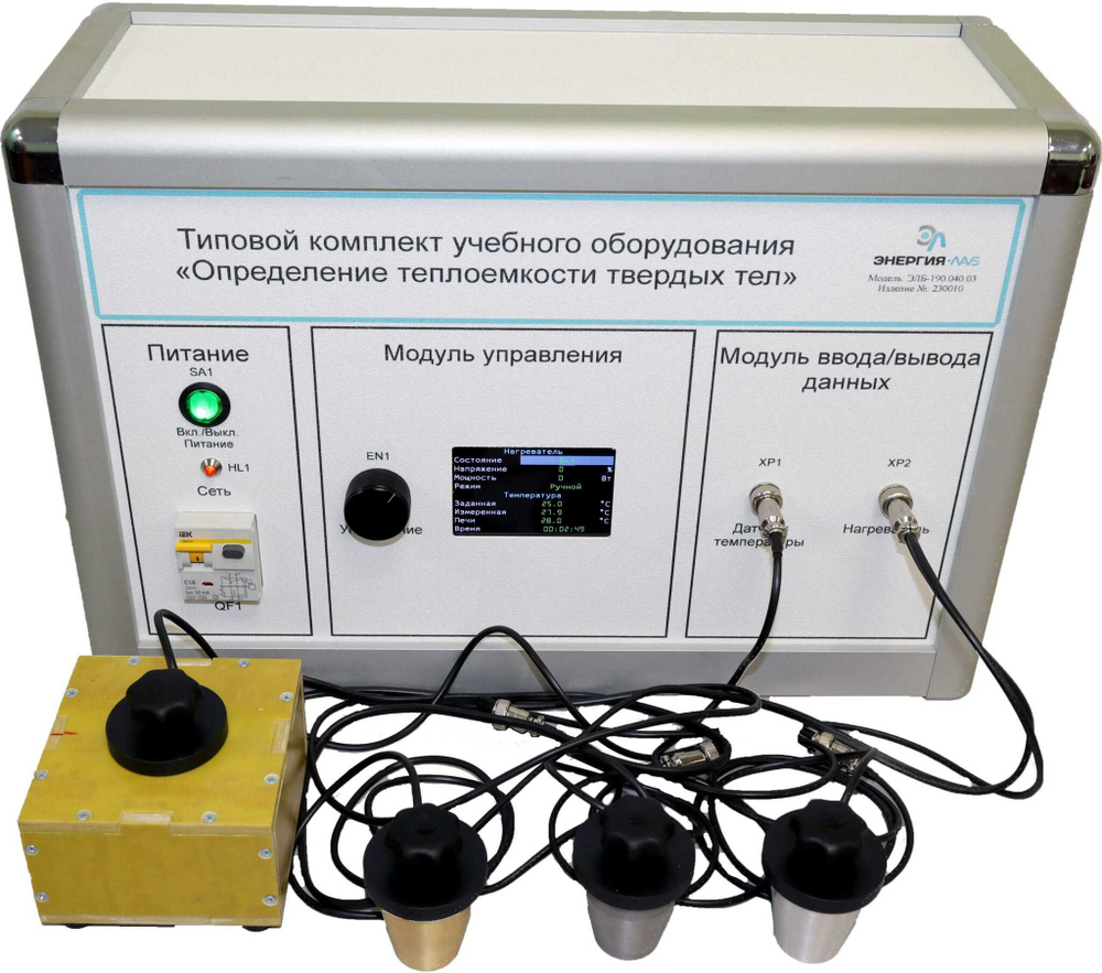 Комплект учебного оборудования состоит из двух частей: модуля для определения теплоемкости твердых тел и блока управления.