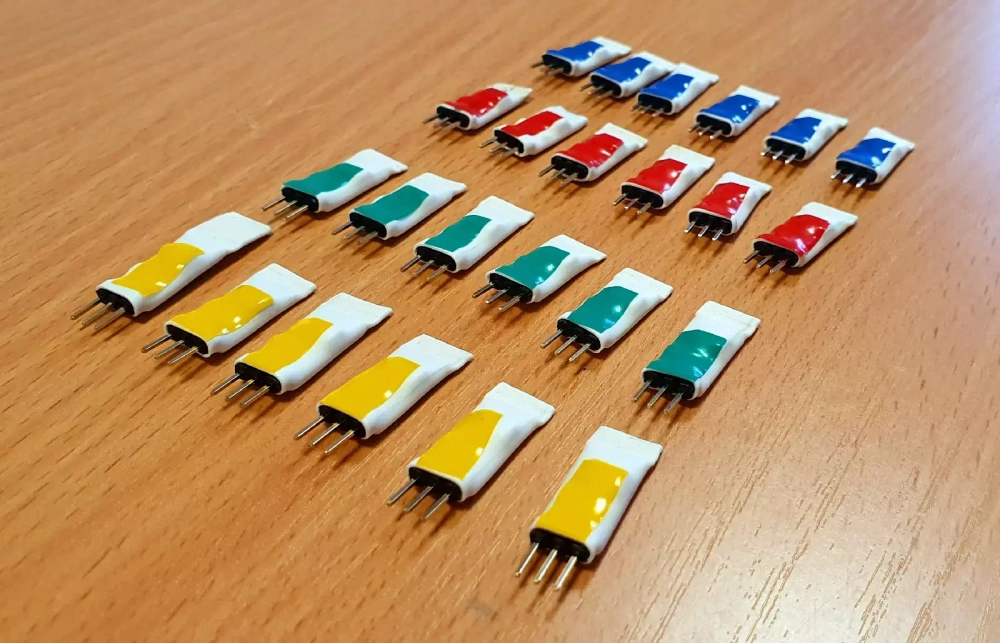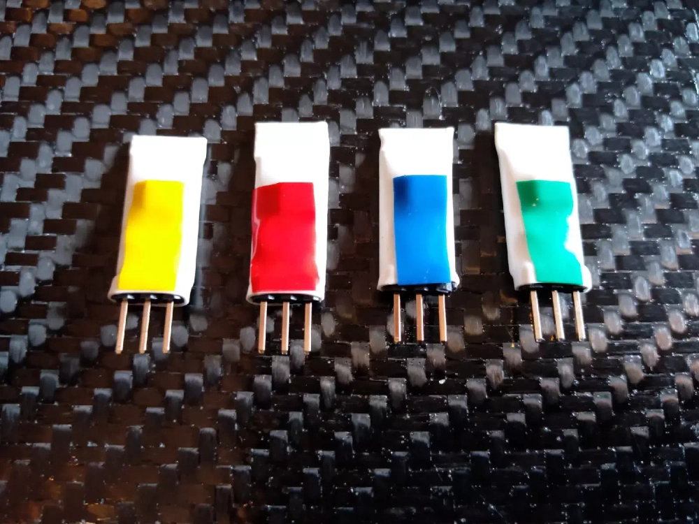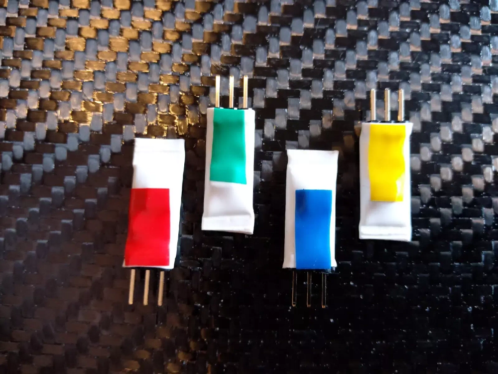 В одном комплекте четыре транспондера: зелёный, красный, желтый, синий.
