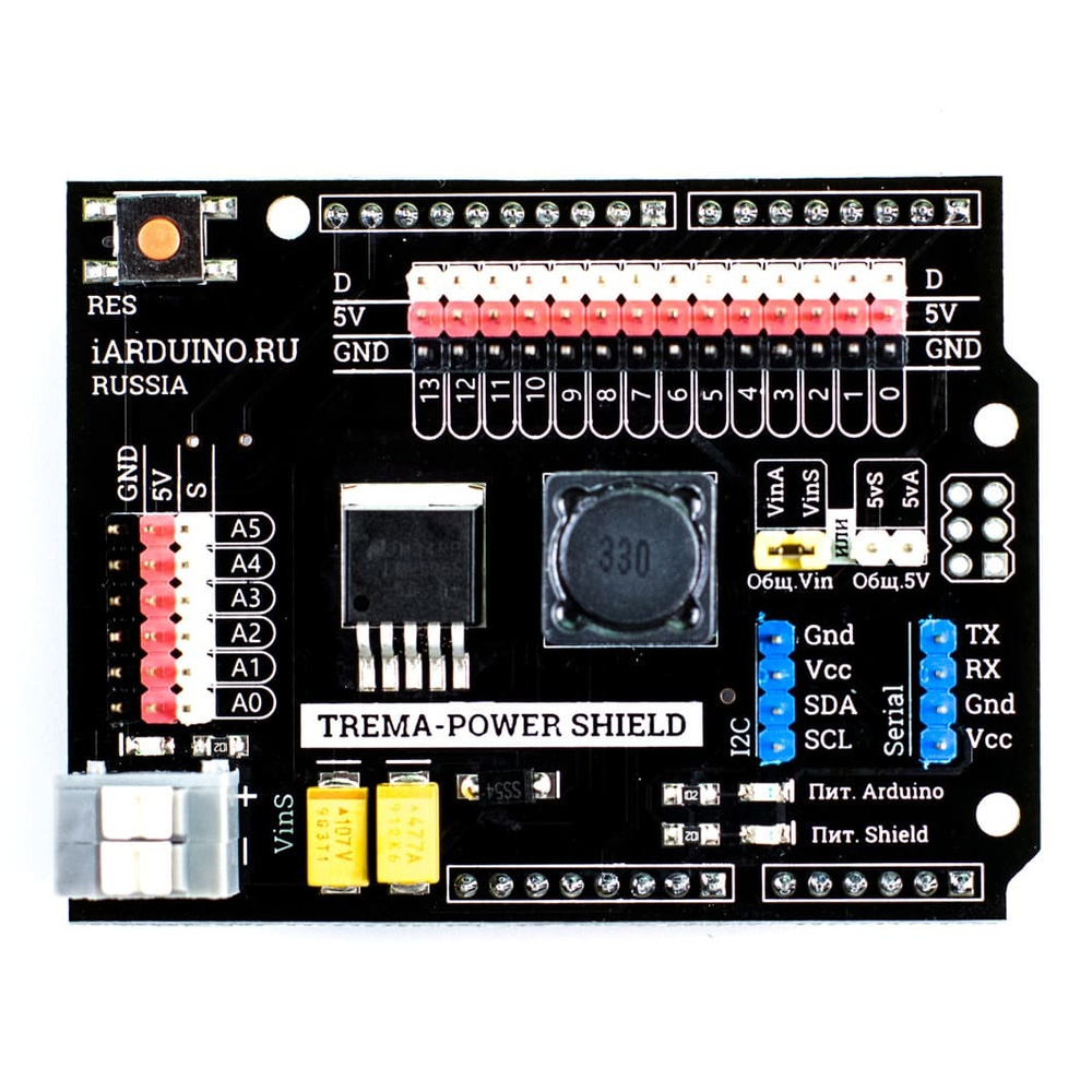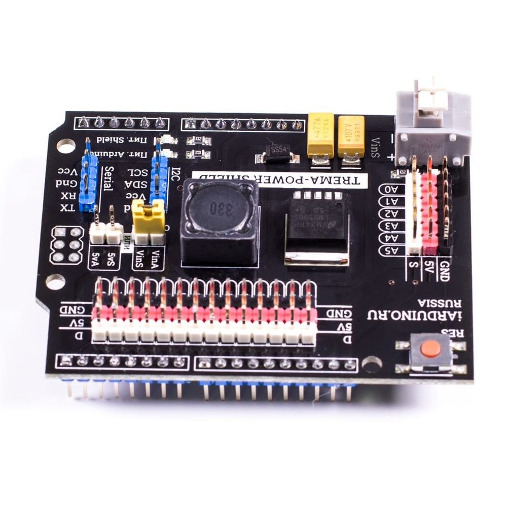 При подключении сервоприводов, моторов, мощных модулей или большого количества модулей к Arduino через Trema Power Shield, нагрузка ляжет на его мощный стабилизатор и Ваше устройство будет работать как Вы запланировали.