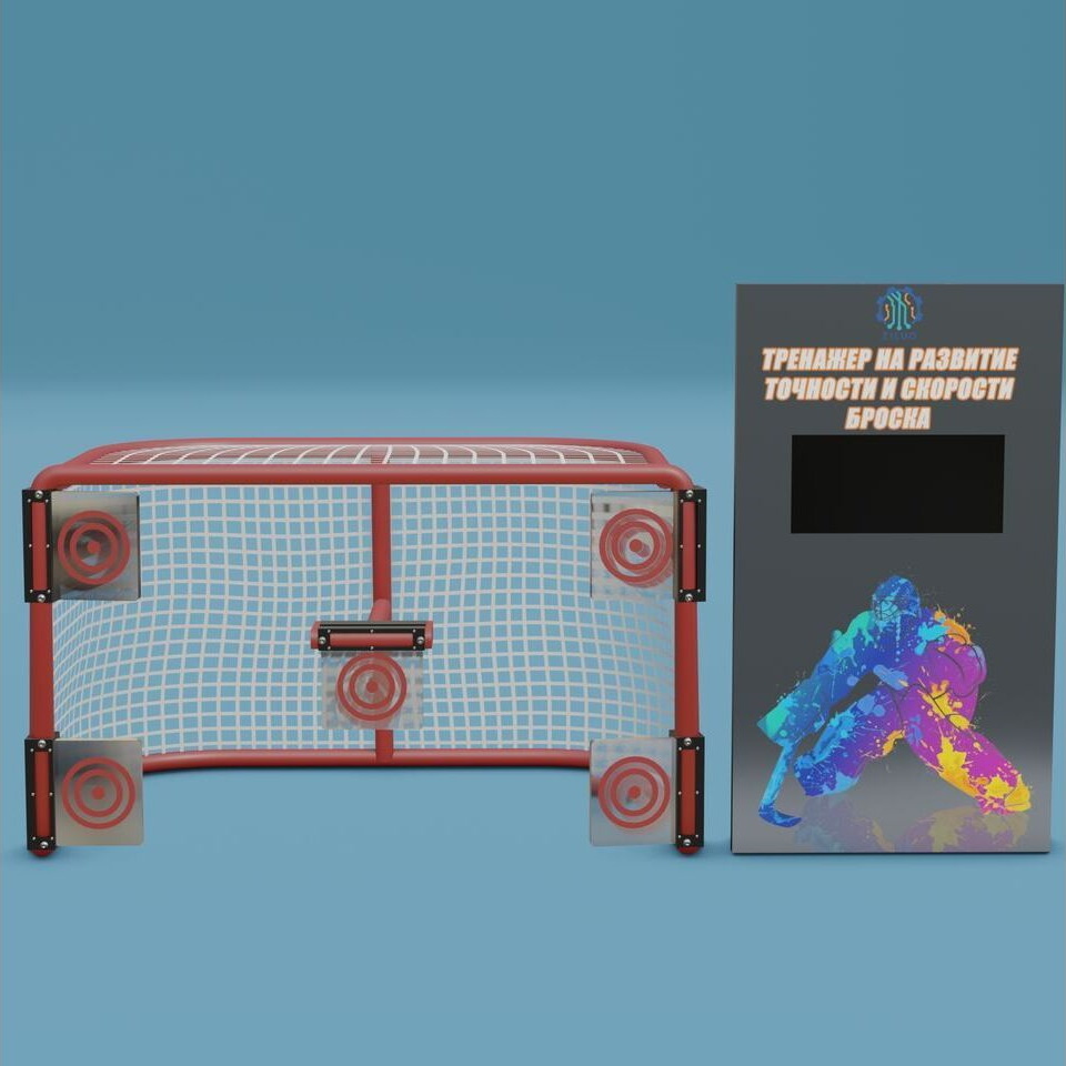 Тренажер представляет собой сочетание конструктивных элементов: управляющий модуль (тумба или планшет на стойке), хоккейные ворота с мишенями, интерактивная площадка игрока.