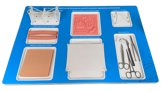 комплект базового хирургического инструмента и материалов для выполнения тренировок.