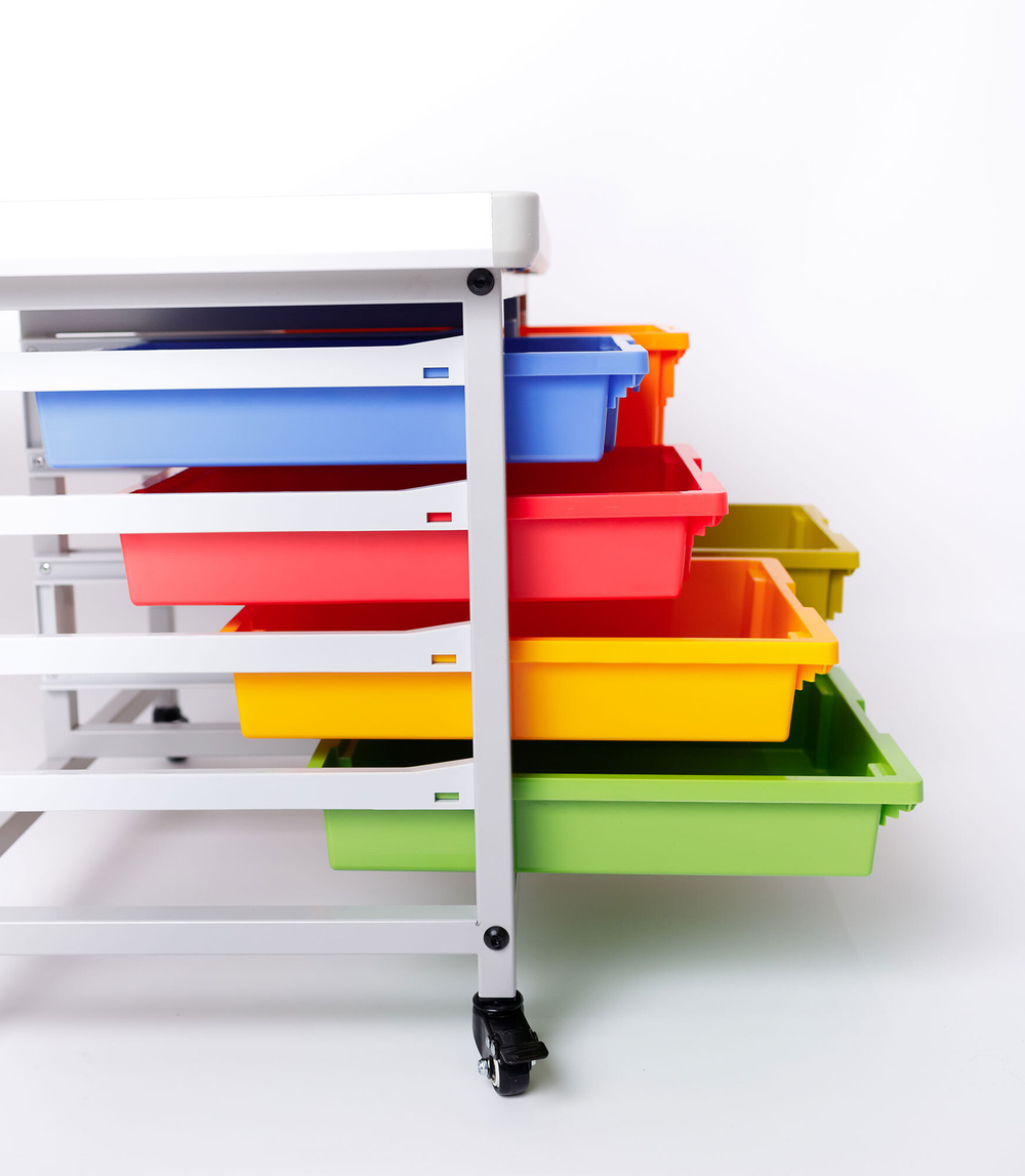 Удобная система хранения материалов - выдвижные ящики разного объема, которые легко могут использоваться детьми самостоятельно.