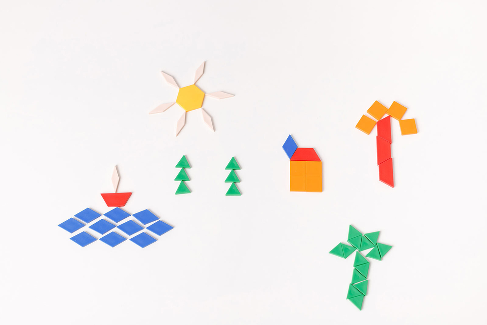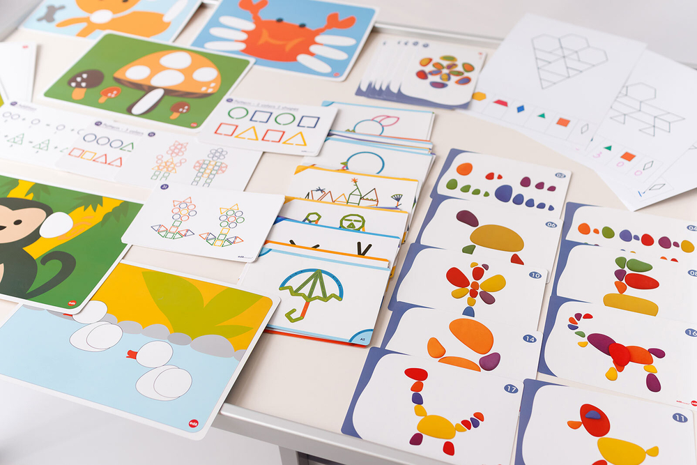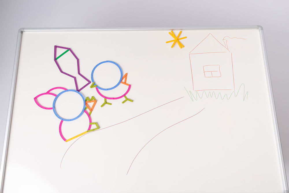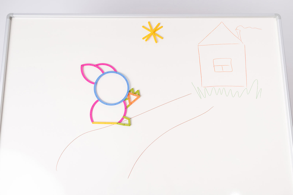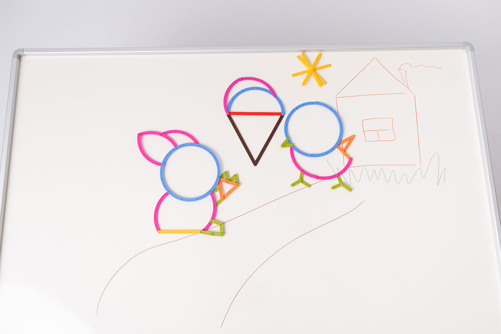 Например, геометрическая мозаика (на первый взгляд математический материал) может стать инструментом для сочинения и рисования историй, а счетный материал дополнит нарисованную на столе картину и превратит ее в объемную.
