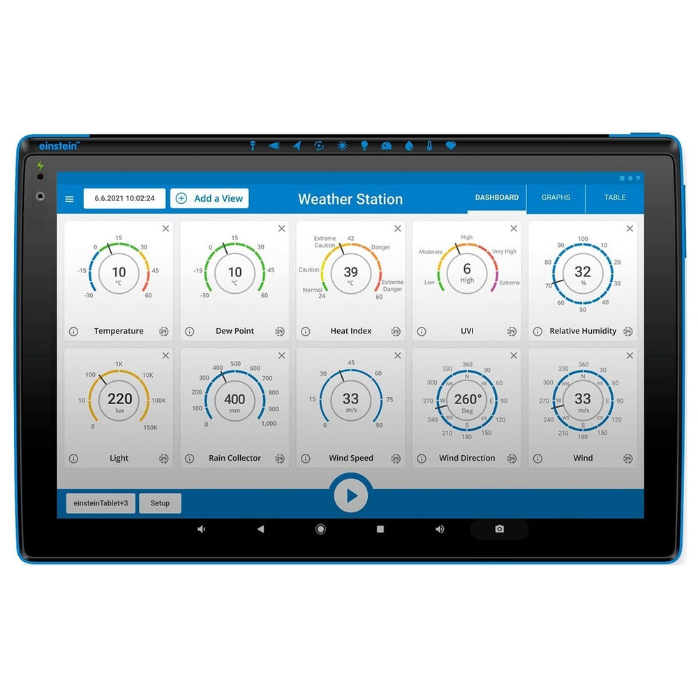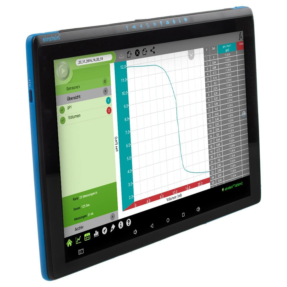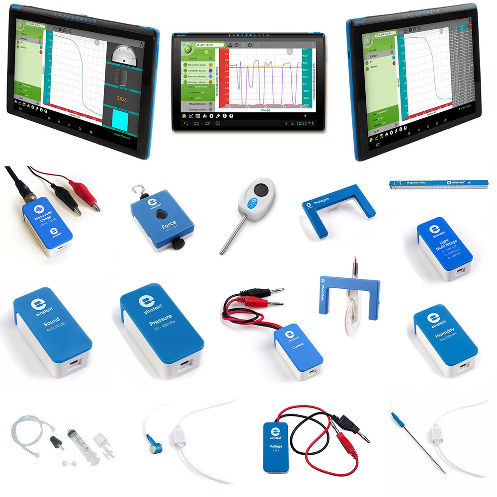 Einstein Tablet - готовый инструмент для проведения экспериментов с использованием планшетного компьютера в качестве регистратора данных и специализированных датчиков. Разработанный с учетом инновационных учебных программ, он является полезным инструментом как в научной лаборатории, так и в классе. Чтобы исследовать мир вокруг нас, мы должны использовать правильные и точные инструменты, поэтому к регистратору данных можно подключить до 8 датчиков через 4 специальных порта.