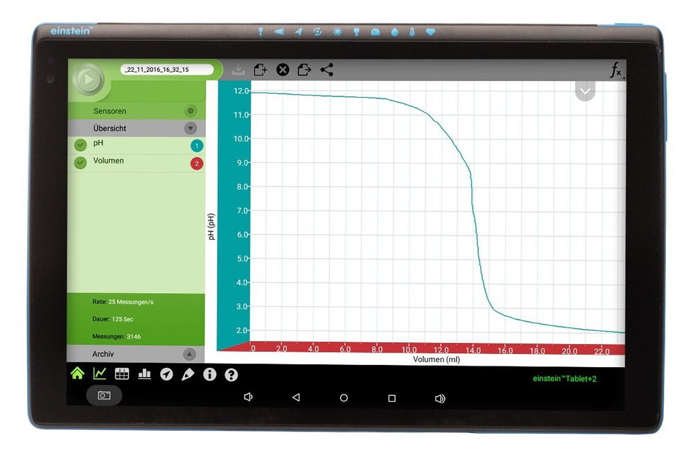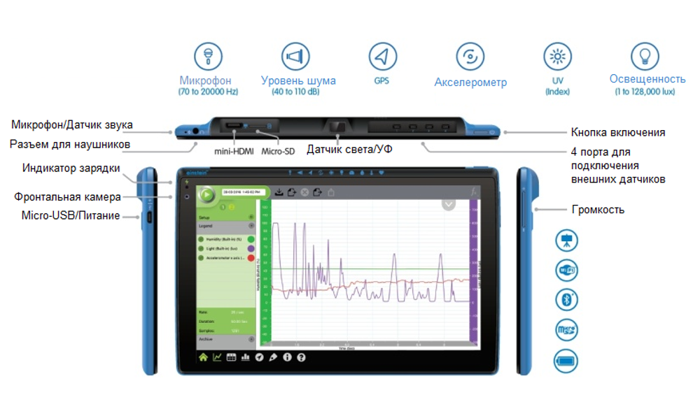 Планшетный регистратор данных Einstein™ Tablet +2, осуществляет сбор и регистрацию данных, поступающих в режиме реального времени с 18 датчиков (используя разные способы соединения), проводит анализ и обработку данных с помощью встроенного программного обеспечения в процессе выполнения естественнонаучных экспериментов. Регистратор способен производить до 100 000 замеров в секунду и осуществлять передачу данных.