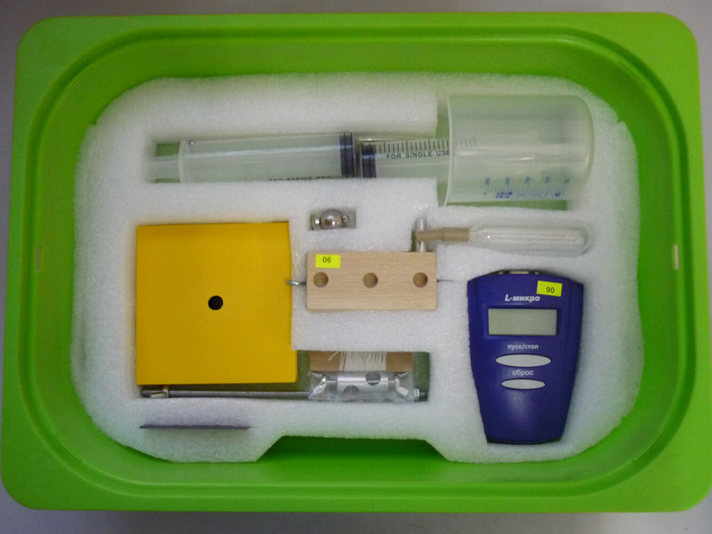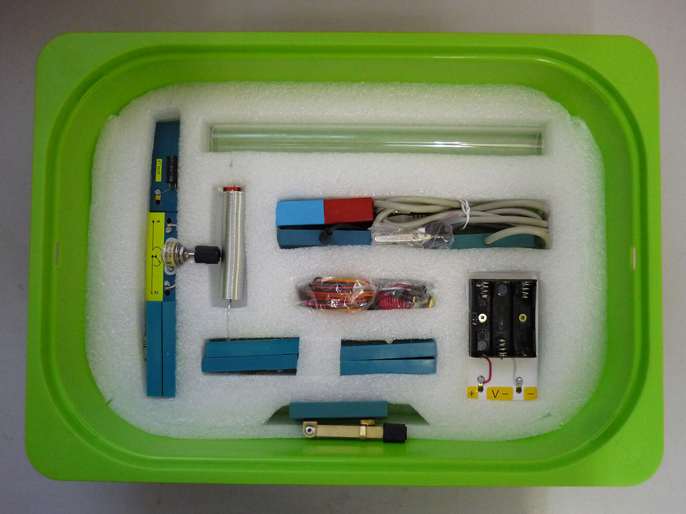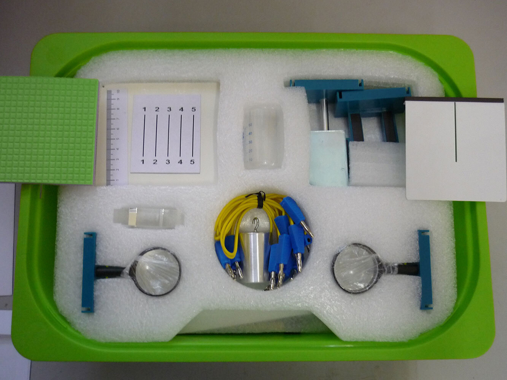 Дополнительное оборудование для цифровой лаборатории: скамья длиной 740 мм, экран стальной размером 155х155 мм, переходник для питания с защитным резистором, резьбовой стержень для закрепления направляющей; каретка с магнитом, шар стальной диаметр 18,3 мм, магнит дисковый диаметром 6 мм, пластина стальная с магнитным слоем, пружина, шприц с ограничителем хода, стакан полипропиленовый (2 шт.), сосуд стеклянный со штуцером, трубка силиконовая, алюминиевой цилиндрическое тело, резисторы (10Ом, 200Ом, 360Ом, 1кОм – 4 шт.), переменный резистор 100 Ом, диод полупроводниковый, модель трансформатора с тремя обмотками, светодиод белый, модель конденсатора, комплект проводов, рейтер с собирающей линзой, рейтер с рассеивающей линзой, зеркало плоское, щелевая диафрагма с магнитом, объект "параллельные линии", линейка на магнитной основе 30 см, зажим-крокодил, ключ.