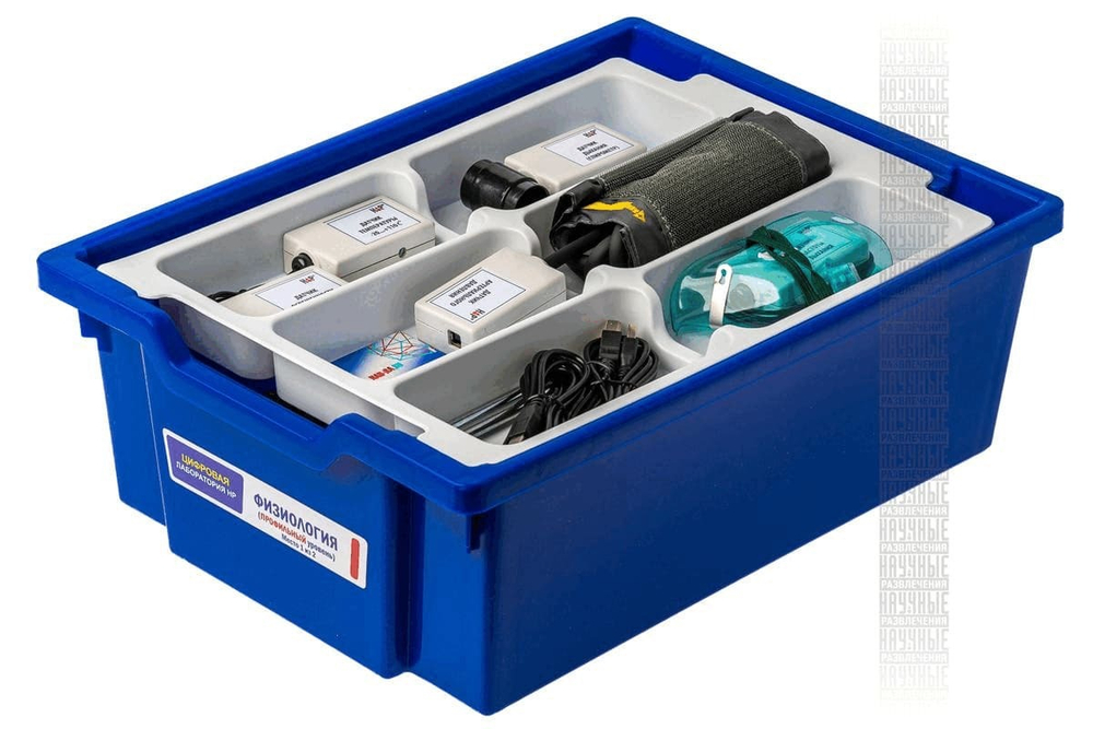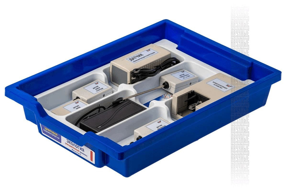 Цифровая лаборатория укомплектована в специальный пластиковый контейнер, который закрывается прозрачной пластиковой крышкой. Комплект оборудования и датчики в контейнере располагается на специальных ложементах.