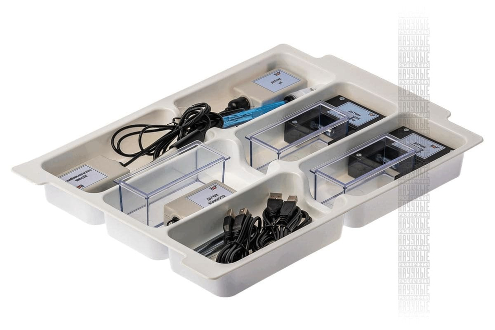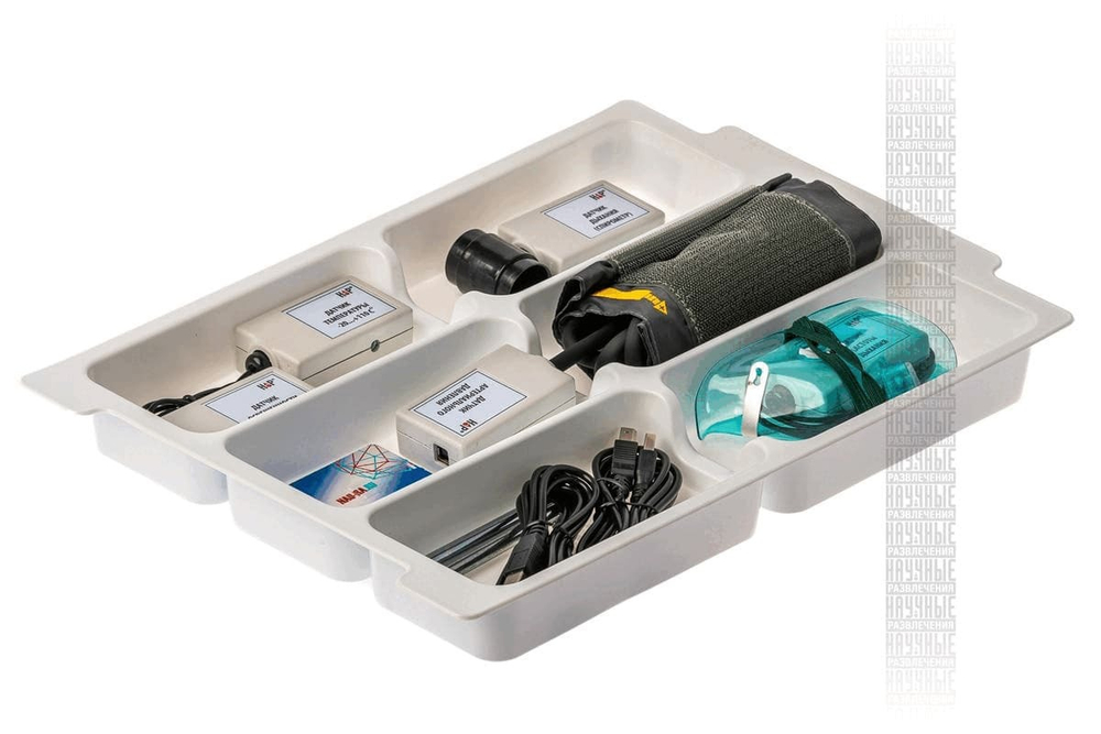 Состав: – Цифровой датчик двуокиси углерода (углекислого газа) – Цифровой Р-датчик освещенности – Цифровой Р-датчик рН (от 0 до 14 ед. pH при 20 градусах Цельсия) – Цифровой Р-датчик температуры (от -20 до +110 градусов Цельсия) – Цифровой датчик артериального давления – Цифровой датчик пульса – Цифровой датчик регистрации ЭКГ – Цифровой датчик частоты дыхания – Цифровой датчик дыхания (спирометр) – Цифровой Р-датчик кислорода (воздух) – Цифровой Р-датчик электропроводности – Цифровой Р-датчик звука с функцией интегрирования – Цифровой датчик ионизирующего излучения – Цифровой датчик окиси углерода – Цифровой датчик хлорид-ионов – Цифровой датчик нитрат-ионов – Цифровой датчик мутности (турбидиметр) – Цифровой датчик концентрации частиц пыли – Комплект беспроводной передачи данных – Набор лабораторной оснастки – Стержень для закрепления датчика в штативе (2 штуки) – Кабель соединительный USB (2 штуки) – Кабель соединительный для IDC разъема – Мундштук спирометра (30 штук) – Кювета (4 штуки) – Программное обеспечение по выполнению экспериментов
