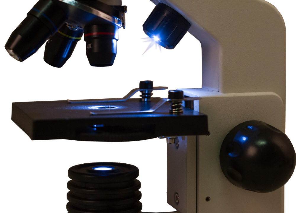 Линзы микроскопа изготовлены из специального оптического стекла, которое отличается высокой прозрачностью. На оптические поверхности нанесено многослойное просветляющее покрытие, поэтому картинка получается четкой и контрастной, с хорошей детализацией. Три объектива позволяют получить широкий диапазон увеличений – от 40 до 400 крат. Чтобы сменить кратность, нужно повернуть револьверное устройство.
