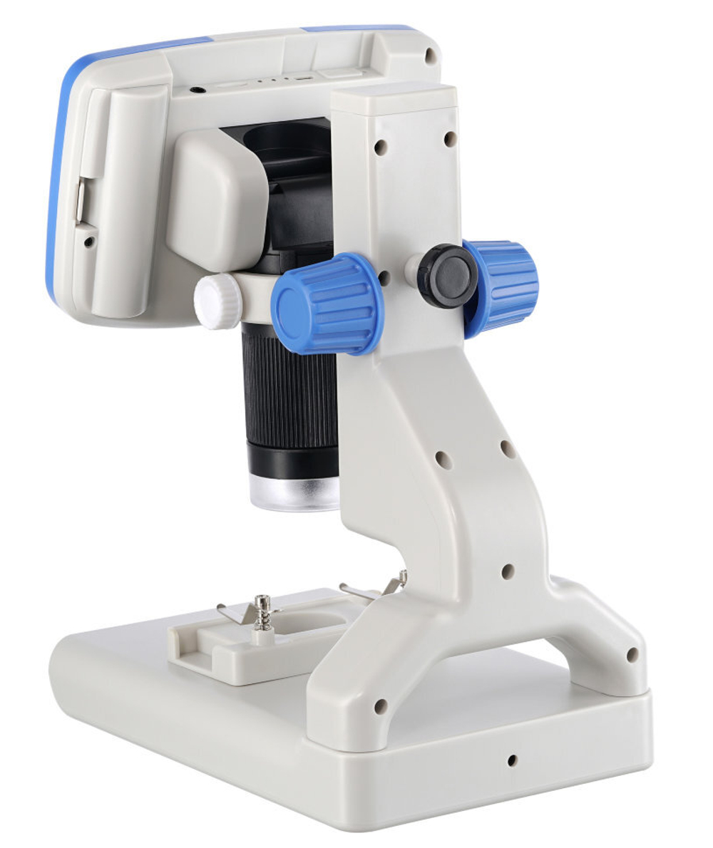 Прибор обеспечивает увеличение в диапазоне от 7 до 200 крат, картинка выводится на встроенный ЖК-экран с диагональю 5 дюймов (12,7 см). Экран передает цветное изображение и может быть отклонен на небольшой угол для более удобной работы. Кнопки управления микроскопом находятся прямо под экраном, но в комплекте есть также и беспроводной пульт дистанционного управления. На него вынесены не все функции, но с его помощью можно запускать запись видео, фотографировать и регулировать увеличение.