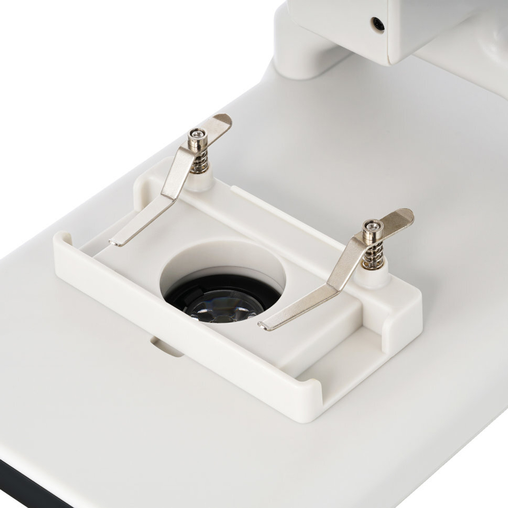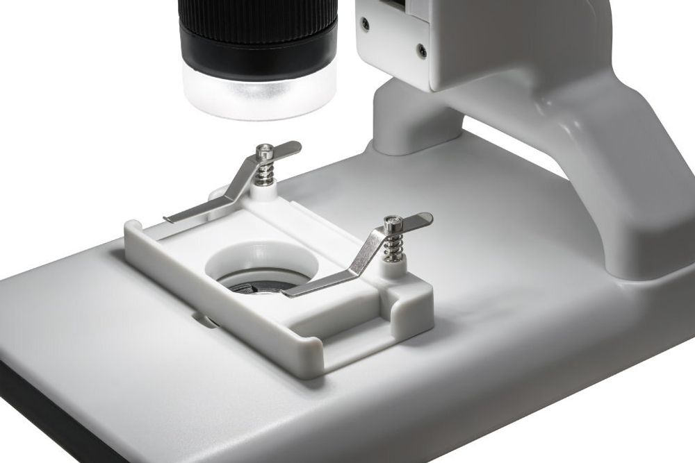 Микропрепараты на предметном столике закрепляются зажимами. Для освещения используются верхняя и нижняя светодиодная подсветки с регулировкой яркости. Подсветка может работать от аккумулятора, что делает прибор более мобильным.