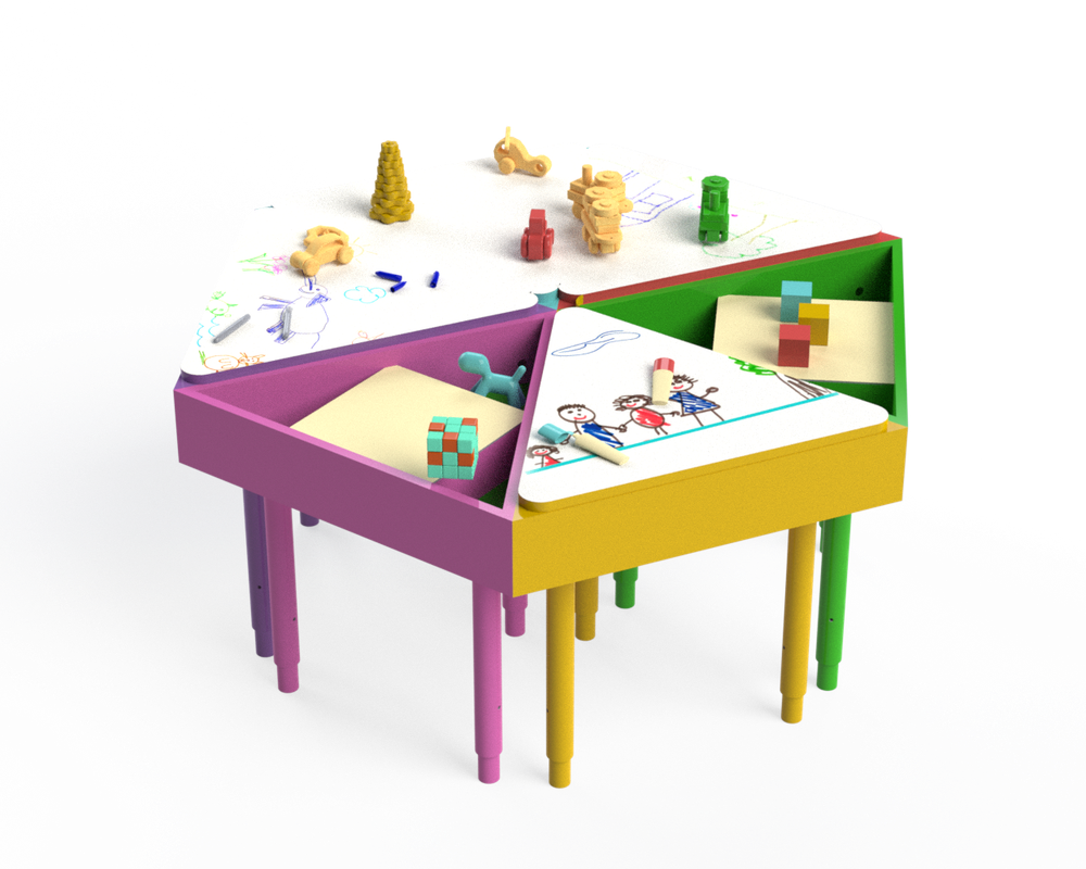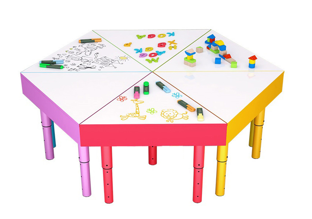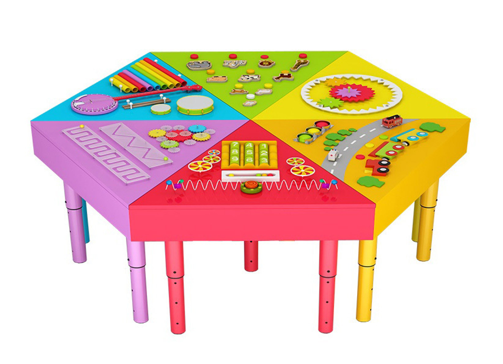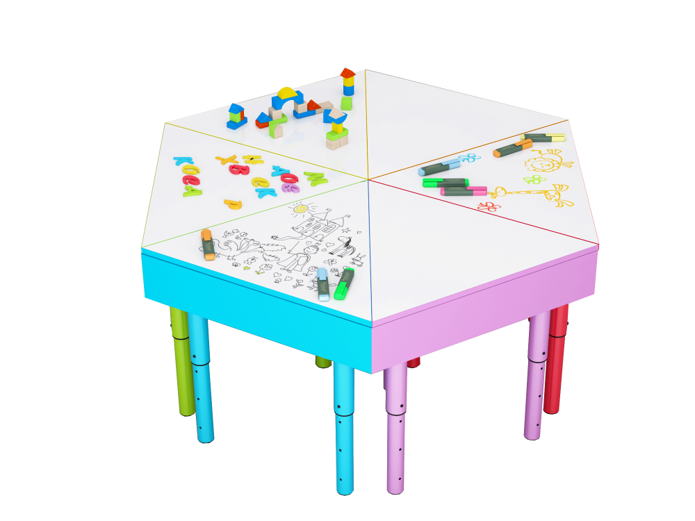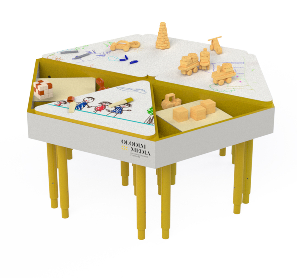 Крышки столов с одной стороны имеют маркерную поверхность, на которой дети могут писать, рисовать, лепить, изучать цифры и буквы, играть и собирать пазлы, а с другой стороны на крышках расположена тактильная поверхность с различными замочками, шнуровками, головоломками. Чтобы дети не поранились – крышки имеют закругленные углы, также это позволяет легко поднимать их и переворачивать.