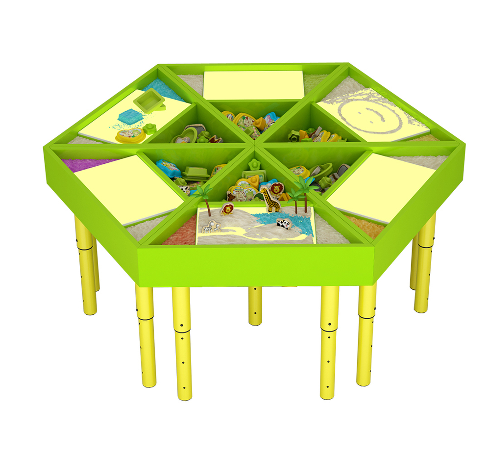 Творческая лаборатория состоит из 6 треугольных секций, образующих шестиугольный стол. В каждой секции есть световой планшет для рисования песком и три отсека: для кинетического, космического песка, формочек и фигурок животных.