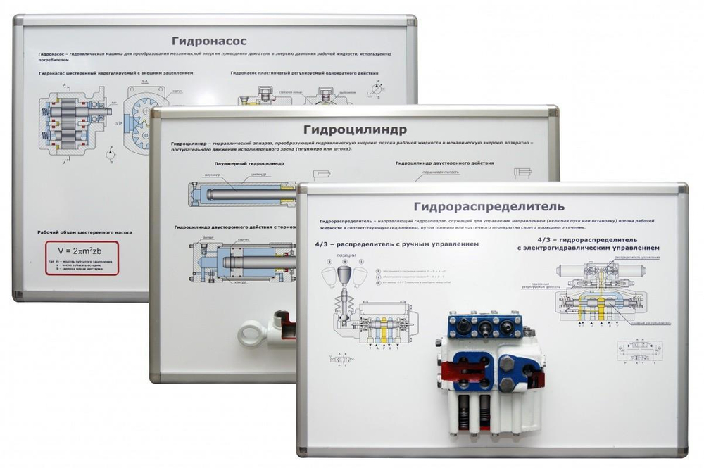 Комплект учебных наглядных плакатов под названием модуль лабораторный «Гидравлика и гидроприводы» состоит в сборе из 3-х учебных плакатов: