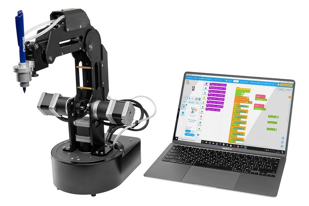 Робот может быть оборудован различными насадками (держатель карандаша или фломастера, пневматическая присоска, захват, устройство для лазерной гравировки или устройство для 3D-печати), тем самым расширяя спектр выполняемых задач и кейсов.