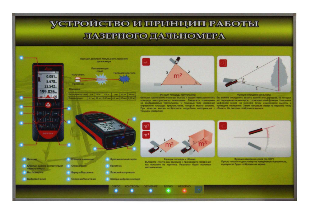Электрифицированный стенд представляет собой информационную панель с раздельной световой индикацией. На стенде представлена информация об устройстве и принципе работы лазерного дальномера, а также о его основных конструктивных элементах. В конструкцию учебного оборудования интегрированы магниточувствительные сенсоры для управления стендом при помощи интерактивного воздействия приемо-передающих устройств. Предусмотрено два режима работы со стендом: "Обучение" и "Контроль".