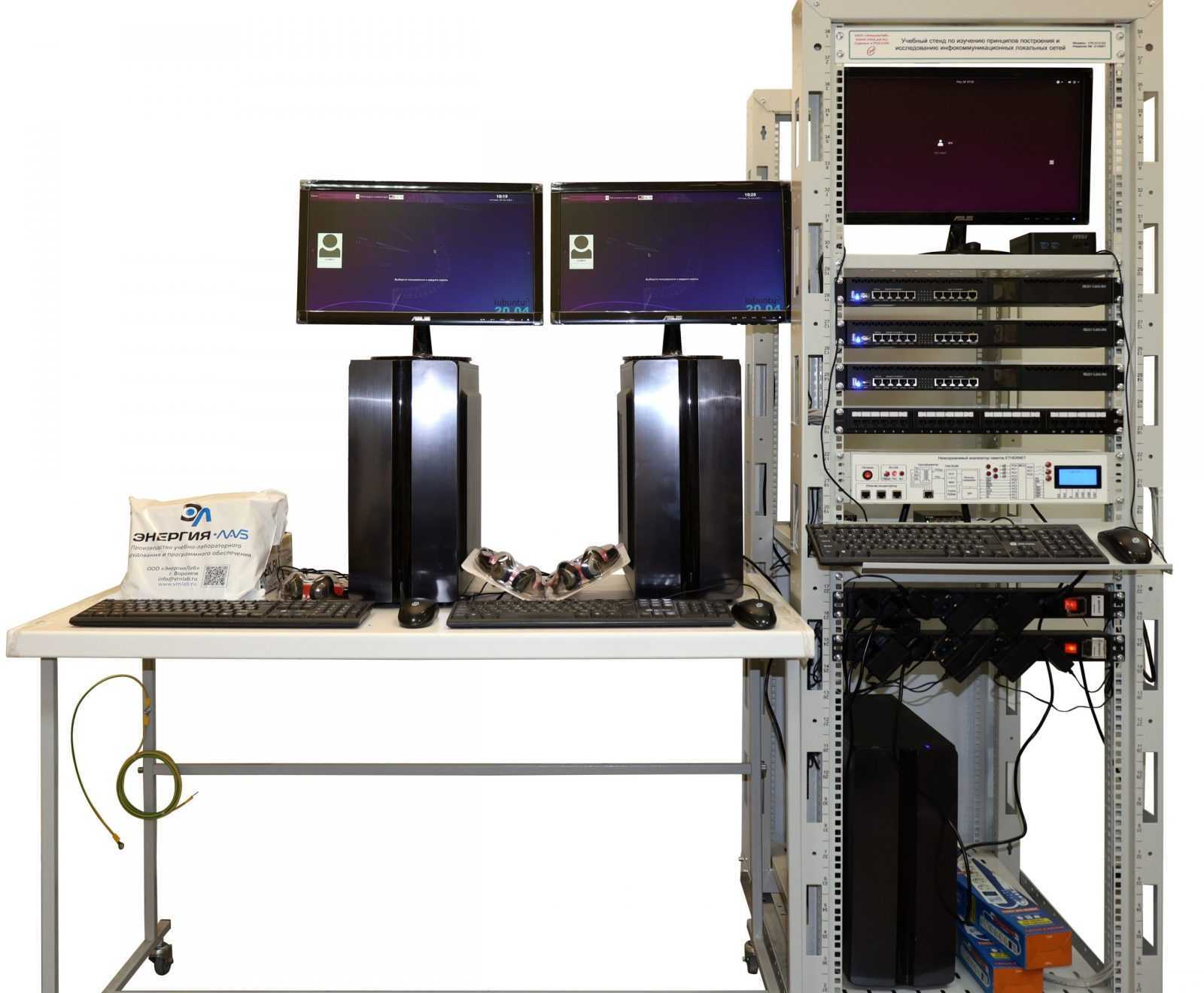 Учебный стенд представляет собой коммутационную стойку с установленным сетевым оборудованием, ПЭВМ в комплекте (учебные рабочие места) и комплект коммутационных патч-кордов.