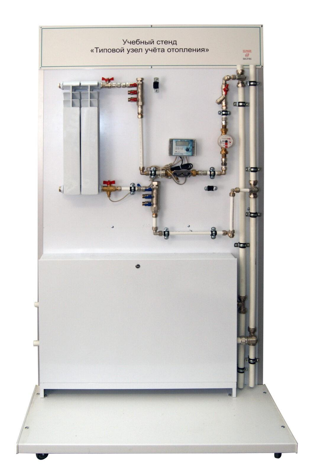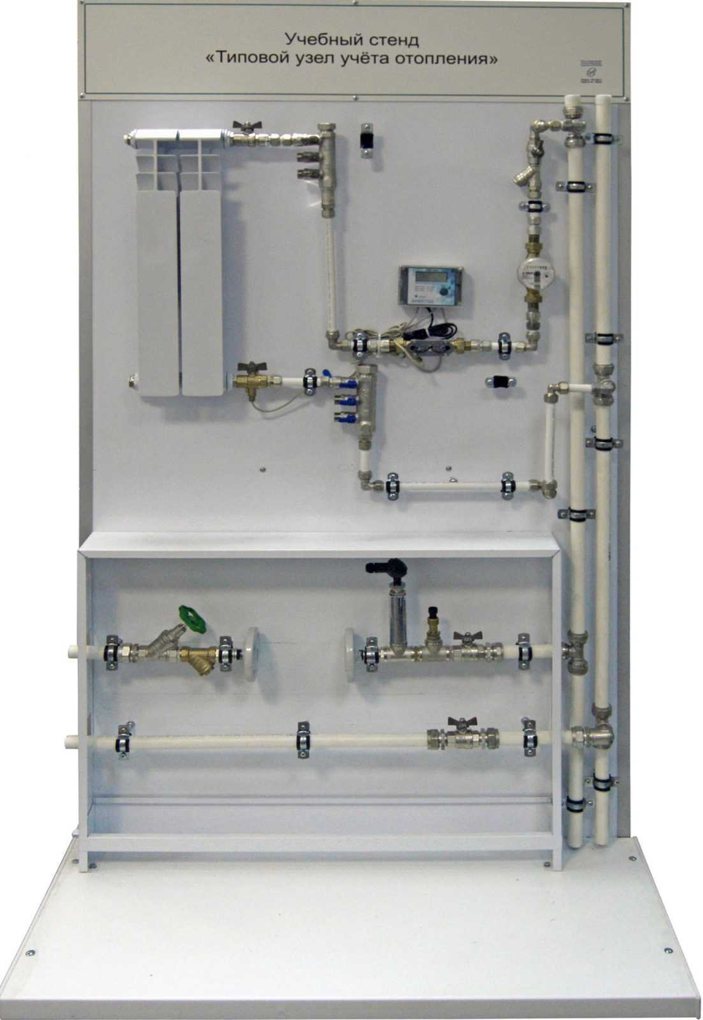 На стенде смонтирована схема типовой узел учета отопления. В наличии обозначения направления жидкости на всех узлах стенда.