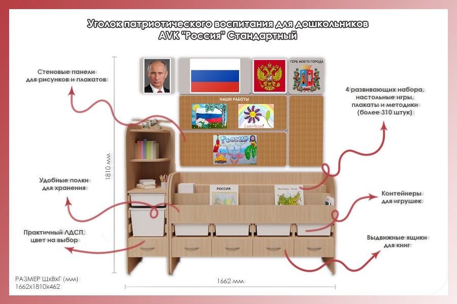 Уголок гражданско-патриотического воспитания «AVKompleks Россия» Стандартный от компании «АВ комплекс» используется для занятий в государственных и частных образовательных учреждениях. С его помощью можно проводить занятия по патриотическому воспитанию, культуре и истории родной страны.