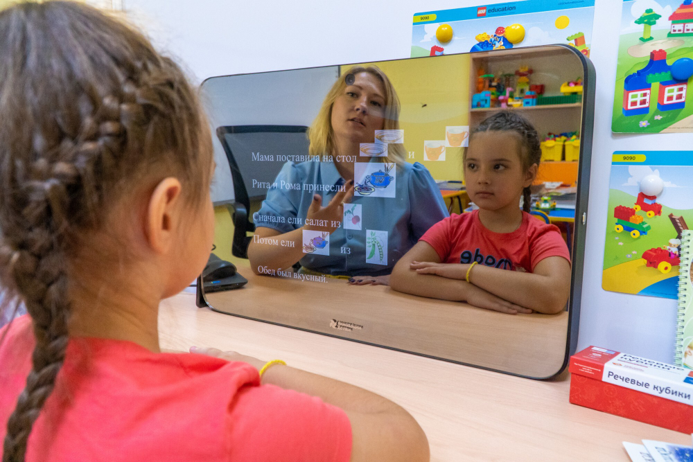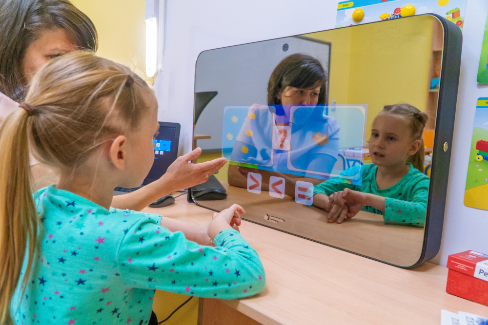 Умное зеркало Artikme широко используется в логопедии. Оно предназначено для детей с целью устранения нарушений речи. Суть работы состоит в том, что ребёнок видит не только своё зеркальное отражение. Он попадает в сказку с волшебными героями, которые помогают ему выполнять артикуляционные, звуковые упражнения, правильно произносить звуки и следить за дыханием.