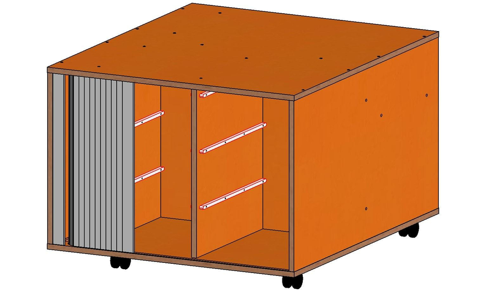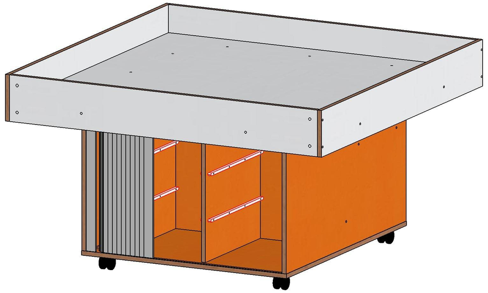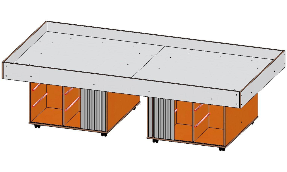 На тумбу кладется лист 1200х1200, и такое поле без бортиков можно использовать как стол для сборки роботов и поле для тестирования. К листу можно прикрепить короткие бортики чтобы получить поле 1200х1200 мм, или соединив еще с одним полем на тумбе и скрепив длинными бортиками получить поле 1200х2400 мм. Тумба перемещается на колесиках со стопорами. Внутрь тумбы на специальные направляющие можно поместить до 10 стандартных коробок LEGO. Также имеется полка для размещения соревновательных элементов и т.п. Тумба с двух сторон закрывается специальными дверьми-жалюзями, двери можно закрыть на ключ.
