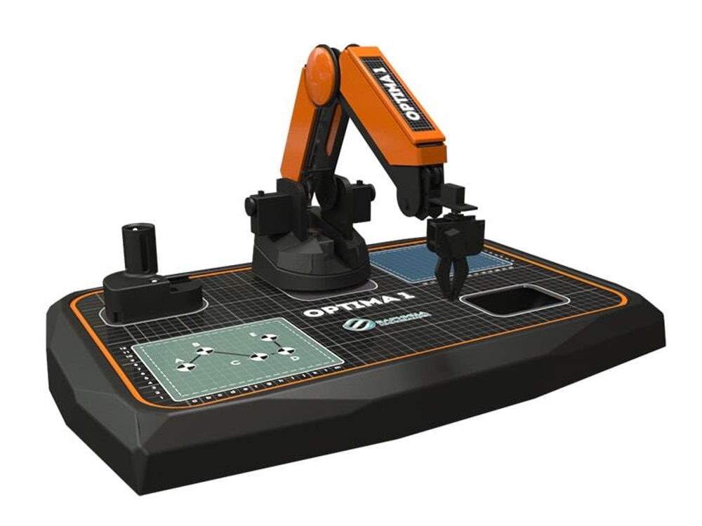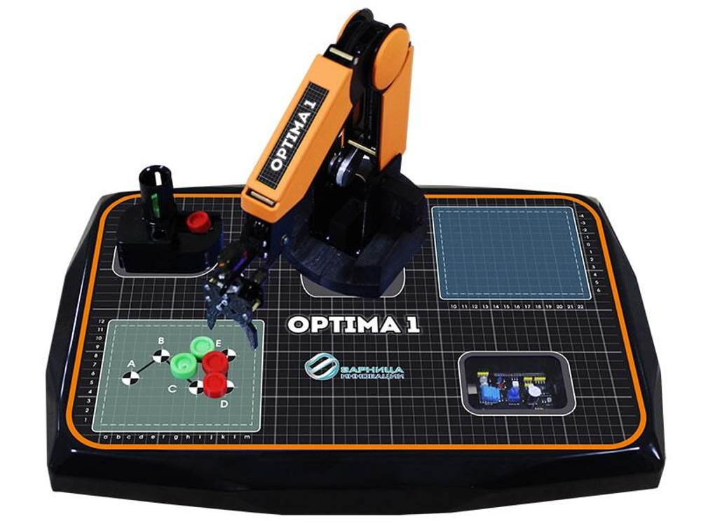Учебный манипулятор Оптима-1 – образовательный комплекс, предназначенный для обучения учащихся программированию микроконтроллеров, алгоритмизации процессов и основам кинематики. Манипулятор выполнен на базе микроконтроллера Arduino Uno – одном из самых популярных на сегодняшний день. Робототехнический комплекс оснащен манипулятором с тремя степенями свободы и механическим схватом, раздатчиком шайб с датчиком цвета и большим кол-вом вспомогательных датчиков и устройств. По желанию заказчика робот может быть оснащен вакуумным захватом (присоской). Комплекс смонтирован на специальном столе с нанесенной разметкой и цветовым маркированием зон для решения практических задач по перемещению заготовок-шайб.